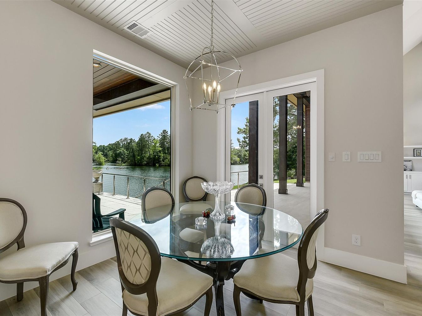 This intimate dining area features a round glass-top table surrounded by six classic upholstered chairs in soft beige tones with dark wooden frames, creating a sophisticated contrast. The walls are painted a light, neutral shade that enhances natural light streaming through a large window and a glass-paneled door, both offering expansive views of a serene lake and lush greenery beyond. A contemporary metal chandelier with exposed bulbs hangs from a white-paneled ceiling, adding modern elegance. Light wood-look flooring ties the space together, blending traditional and modern design elements for a peaceful, inviting dining experience.