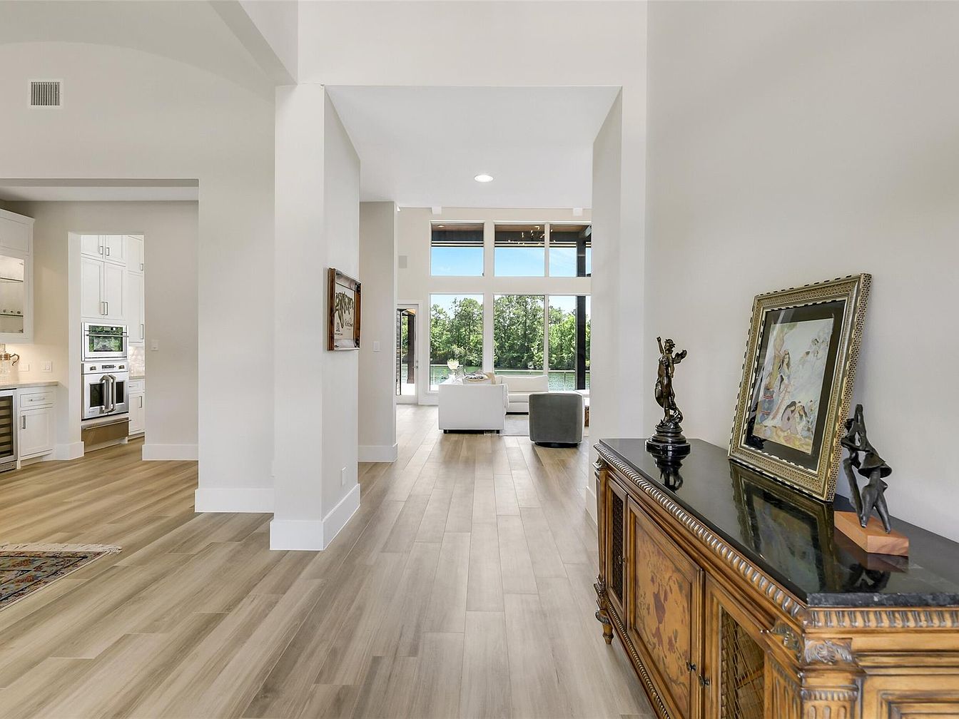 This welcoming entryway flows seamlessly into a bright living room with expansive floor-to-ceiling windows, offering a stunning view of lush greenery and water beyond. The neutral palette features soft beige walls and light wood-look flooring that adds warmth and continuity. White trim accents the clean architectural lines, while recessed lighting ensures the space remains luminous. On the right, an ornate wooden console with a black granite top showcases elegant sculptures and a framed artwork, blending classic charm with contemporary sophistication. To the left, a glimpse of the modern kitchen emphasizes the open and airy layout of this home.