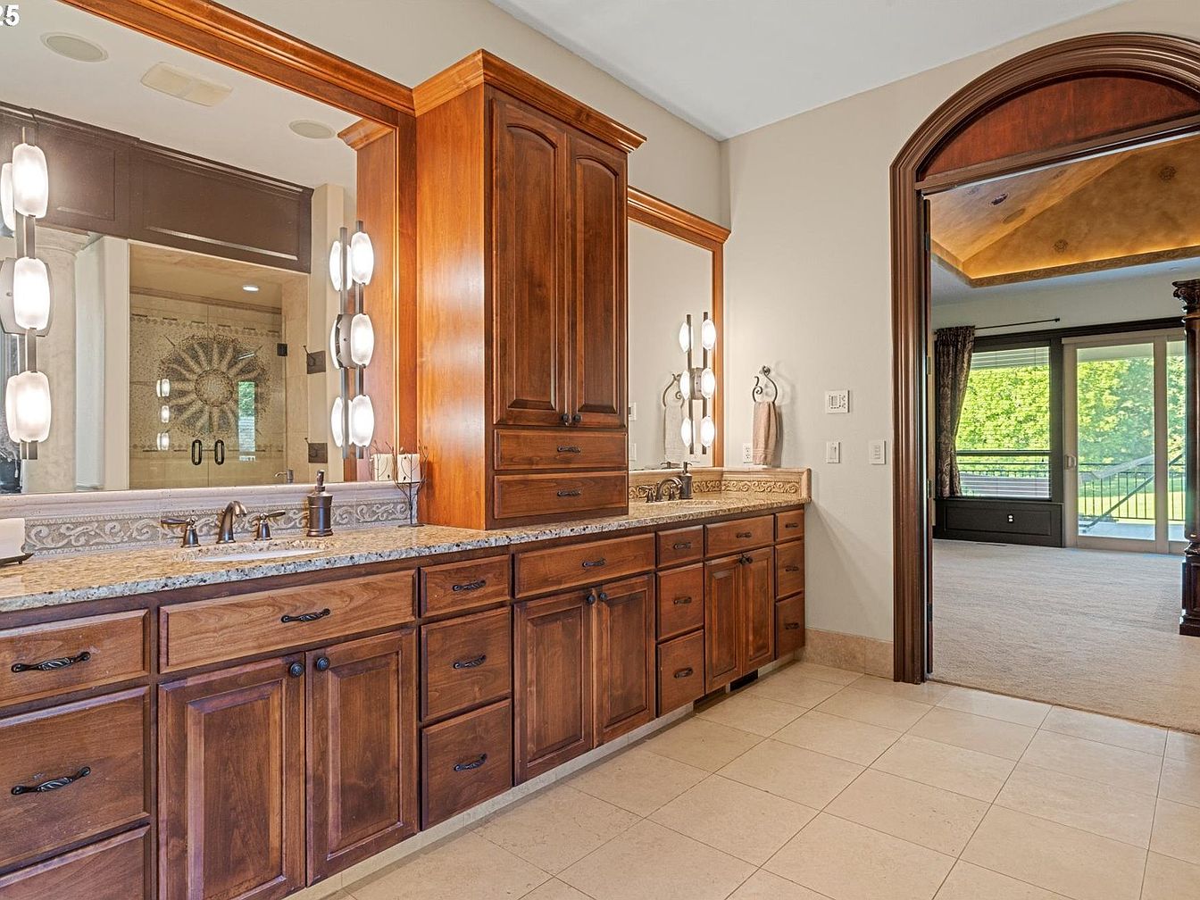 This spacious master bathroom features an elegant double vanity with rich dark wood cabinetry contrasted by a polished granite countertop. The extensive cabinetry provides ample storage, with a tall central cabinet dividing the two sinks for added organization. Warm, neutral tile flooring complements the wood tones, enhancing the room’s inviting ambiance. Soft wall sconces on either side of the large mirrors offer gentle, flattering lighting. Beyond an arched doorway lies a bedroom with large windows and sliding doors, allowing natural light to flow through, creating a seamless connection between the bathroom and living space.