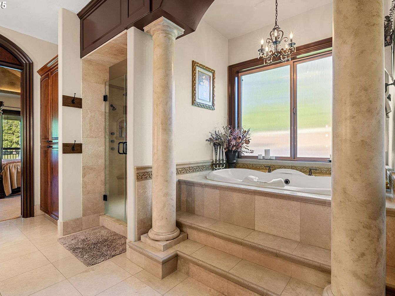 This master bathroom exudes luxury with its warm beige marble tile flooring and coordinated wall accents. The sunken bathtub, framed by classic steps and flanked by elegant marble columns, offers a spa-like centerpiece beneath a large textured window that softly filters natural light. A decorative chandelier overhead adds a refined touch, enhancing the room’s sophisticated ambiance. The adjacent glass-enclosed shower, tiled to match the surrounding stone, complements the room’s earthy tones and rich wood trim seen in the door frame and cabinetry. Subtle decorative details like a framed artwork and floral arrangement personalize this serene bathing space.