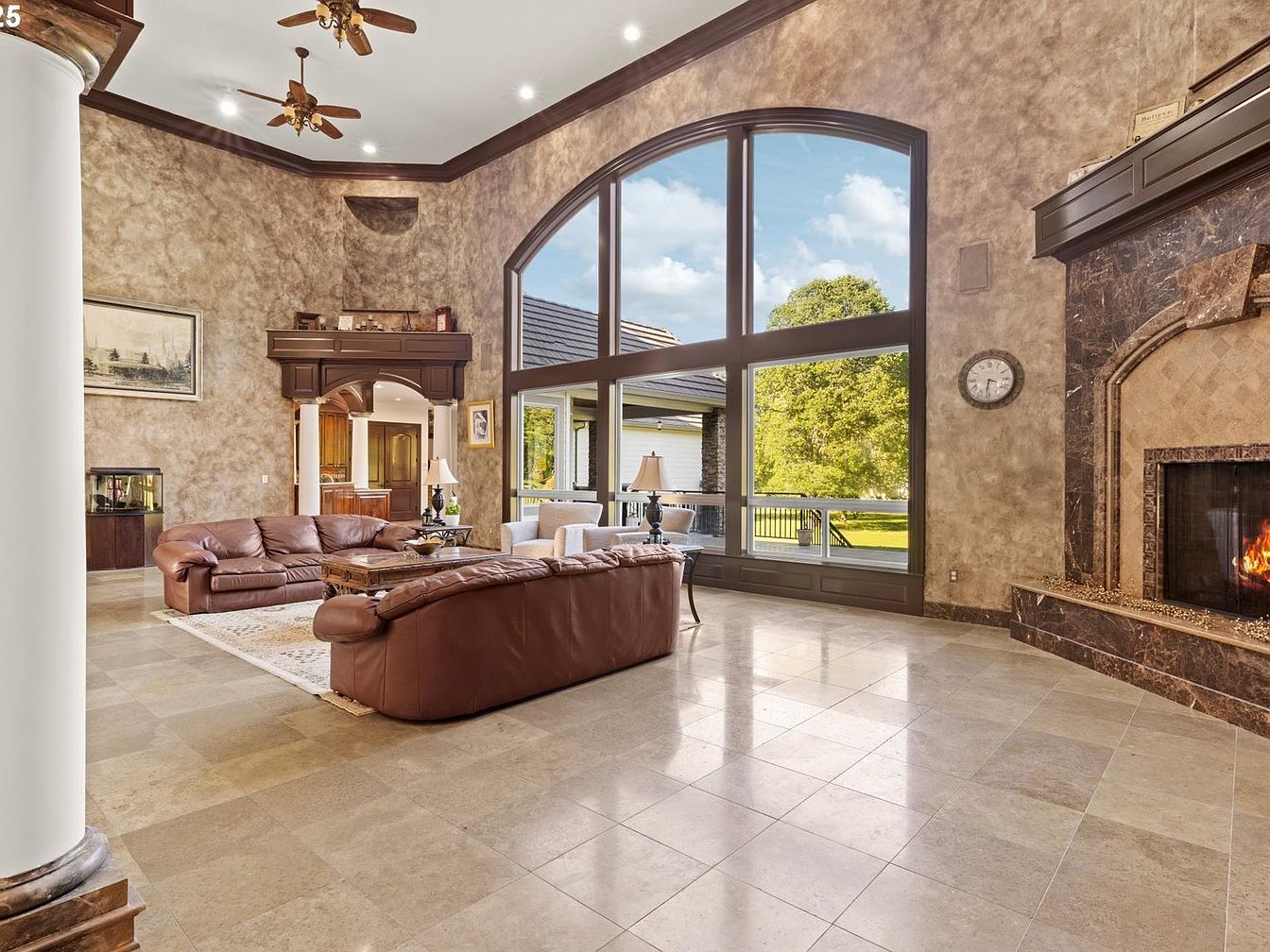 This expansive living room features floor-to-ceiling arched windows that flood the space with natural light and provide a stunning view of lush greenery outside. Earthy tones dominate, with textured taupe walls, beige tiled floors, and rich dark wood crown molding and trim. Comfortable brown leather sofas sit atop a soft area rug, arranged for inviting conversation. A grand fireplace with deep brown marble surrounds anchors one corner, adding warmth and elegance. Architectural columns and an ornately detailed entryway lead to adjacent rooms, creating a seamless flow in this luxurious, open-concept space.