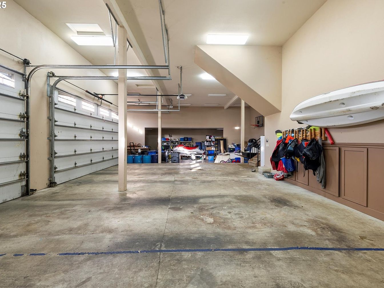 This spacious garage features a concrete floor with some wear marks, large enough for multiple vehicles. The walls are painted a soft beige with a brown wainscoting panel along the lower half, adding subtle architectural interest. On the right wall, there is a mounted kayak and a series of hooks holding an array of jackets and gear, revealing an organized storage approach. The far end includes additional shelving units filled with storage bins, giving the space a practical, utilitarian feel. Ample lighting from overhead fixtures and windows on the garage door create a bright, functional environment.