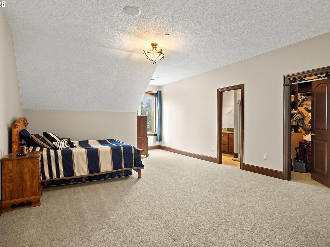 This bedroom features a tranquil and spacious layout with a soft beige carpet that creates warmth and comfort underfoot. The walls are painted in a light neutral tone, enhancing the room’s brightness. A wooden bed frame with striped blue and beige bedding sits along one wall, paired with a matching wooden nightstand. Two doorways lead off the room—one reveals a walk-in closet filled with storage, the other opens into an adjoining bathroom with granite countertops and wooden cabinetry. Natural light filters through a large window with blue curtains, contributing to the inviting atmosphere.