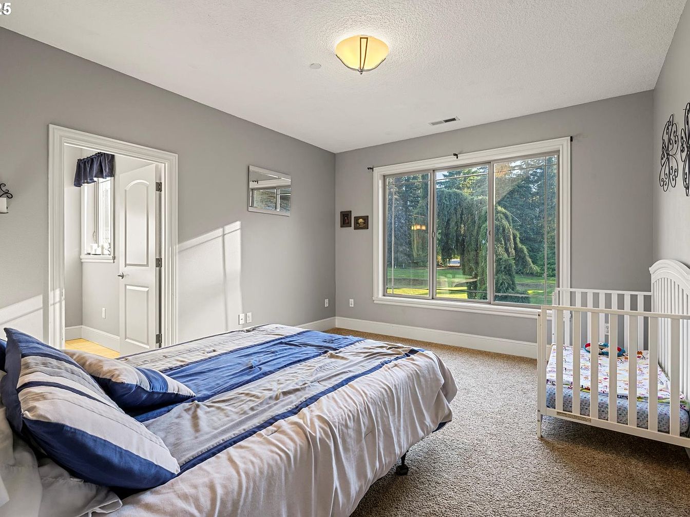 This serene master bedroom combines comfort with functional design, featuring a spacious layout with neutral gray walls and beige carpeting that enhances the softness of the space. The bed is dressed in a striped blue and white duvet with matching pillows, adding a calming coastal vibe. A large window offers a majestic view of lush greenery outside, inviting natural light to fill the room. On one side, a white wooden crib establishes a cozy nursery corner. Minimalist decor, including a small wall mirror and simple artwork, keeps the room uncluttered and relaxing.