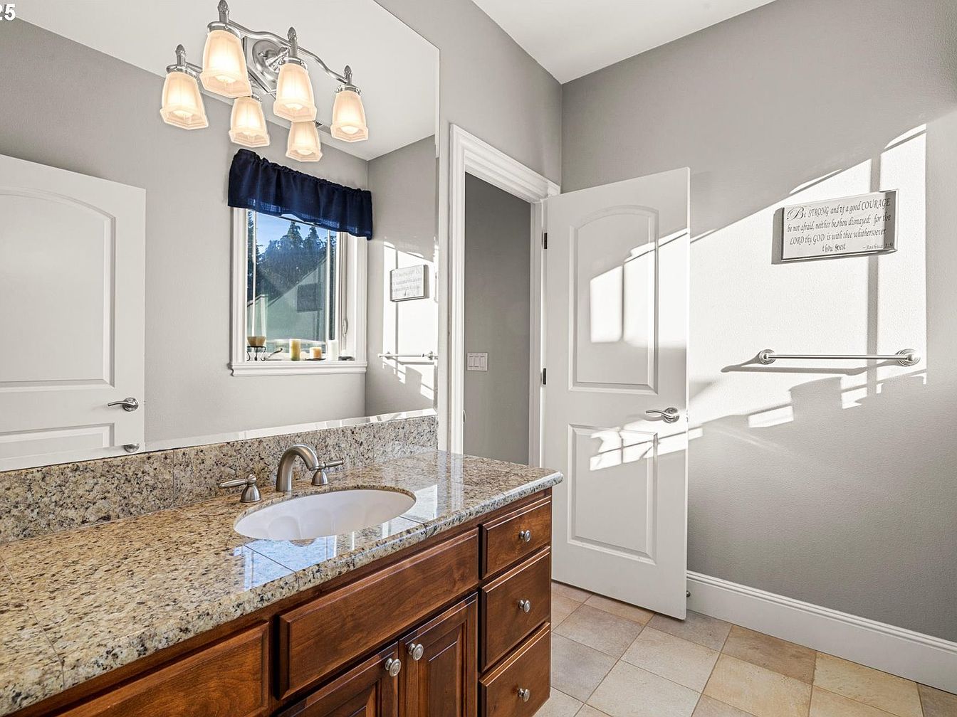 This bathroom corner features a polished granite countertop with warm beige and brown tones resting on rich, dark wood cabinetry with simple silver knobs. A single under-mount sink is paired with a sleek metallic faucet. The walls are painted a soft gray, giving the space a calm, contemporary vibe. Above the sink hangs a large mirror reflecting natural light pouring in through a small window adorned with a navy blue valance. White trim and doors with classic paneling frame the space, complemented by the beige tiled floor. A towel bar and inspirational wall art add finishing touches to this bright, understated bathroom.