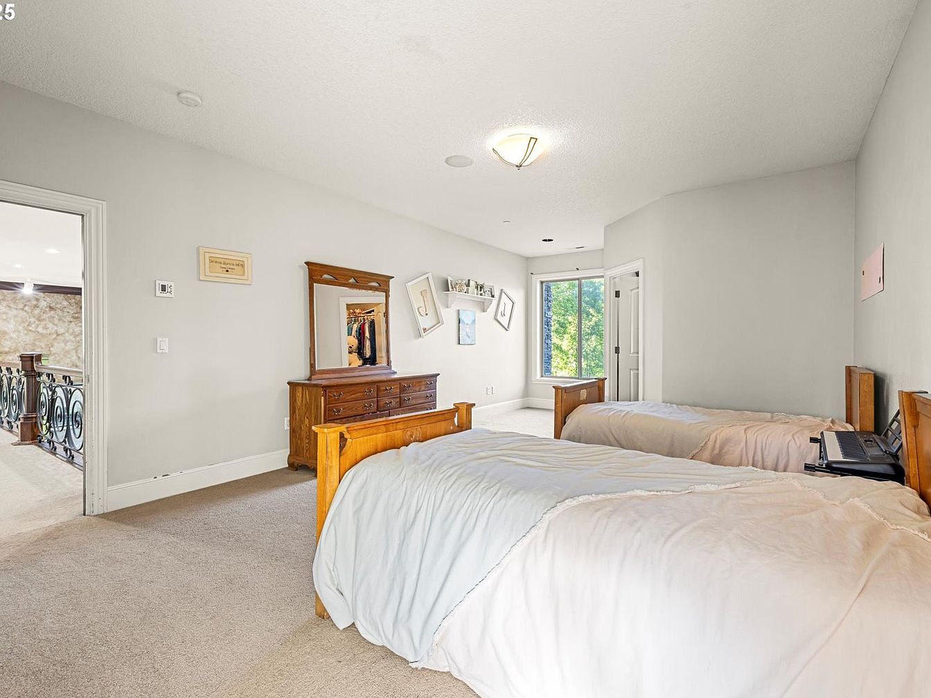 This guest bedroom is spacious and bright, featuring two twin wooden beds with clean, neutral bedding in soft pastel tones. A classic wooden dresser with an attached mirror adds a touch of traditional elegance along one wall. The walls are painted a light, calming gray, complementing the beige carpet flooring, which enhances warmth and softness underfoot. Natural light floods in through a sizable window at the far end, framed by white molding that matches the door trims. Minimal wall decor includes framed artwork and floating shelves for a subtle, personalized touch, maintaining a serene and inviting atmosphere.