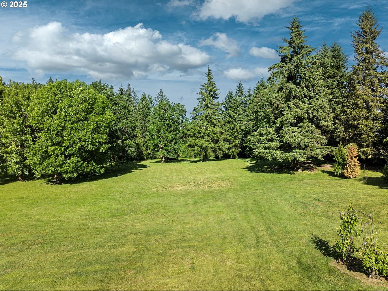 This expansive backyard features a sprawling green lawn bordered by a variety of mature trees, including evergreens and broadleaf species, creating a natural screen and enhancing privacy. The grass appears well-maintained, offering a smooth, open space suitable for outdoor activities or relaxation. The sky above is bright blue with scattered clouds, casting a pleasant natural light over the scene. The landscape design emphasizes open green space combined with lush foliage, offering a tranquil and inviting outdoor environment that blends seamlessly into the surrounding nature.
