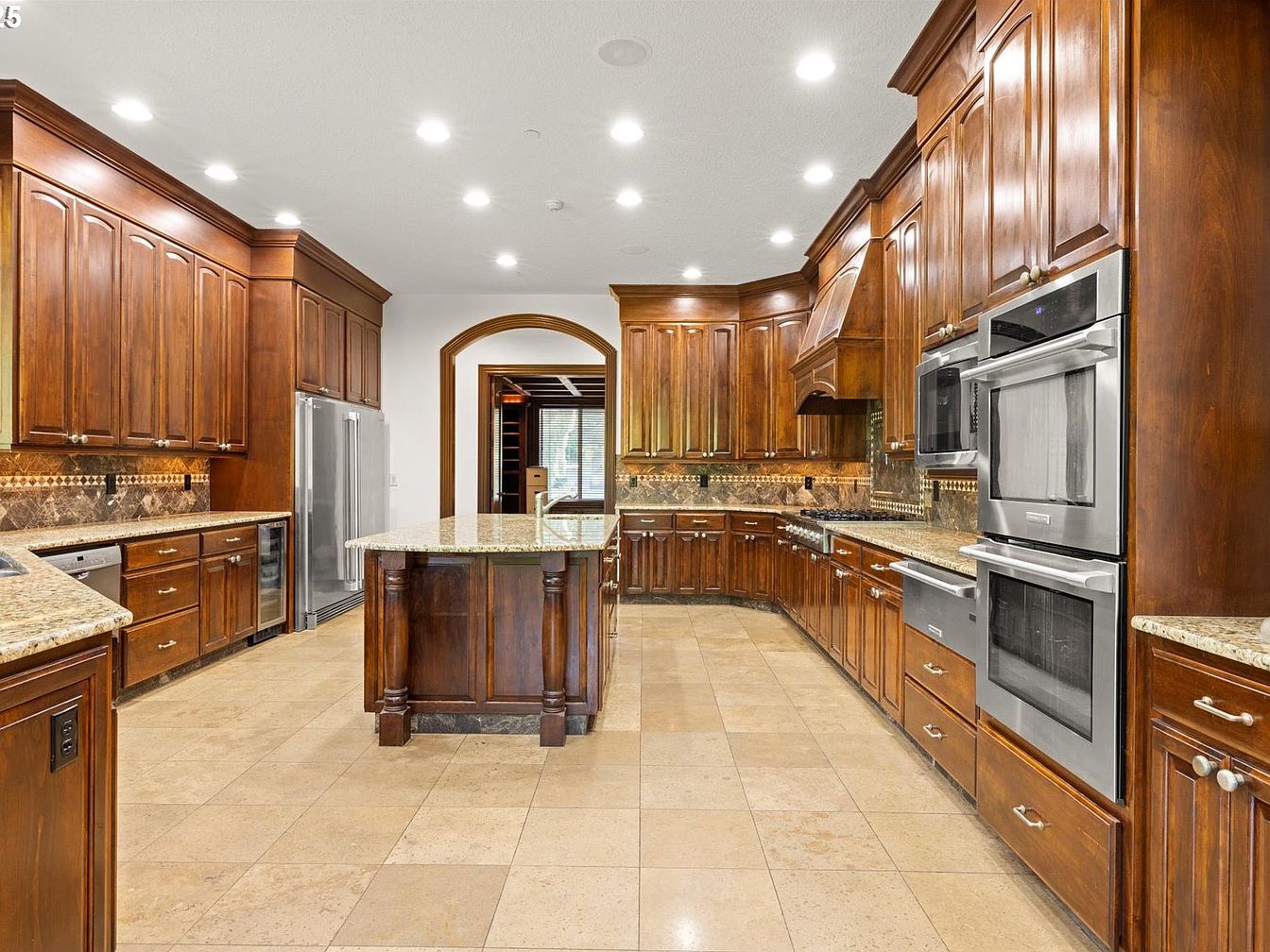 This kitchen exudes warmth with its extensive use of rich, dark wood cabinets that span from floor to ceiling, providing ample storage. The centerpiece island, crafted from matching wood and topped with polished granite, offers additional workspace and a sink, framed by intricately carved legs. Stainless steel appliances, including a double wall oven and a built-in microwave, add a sleek, modern contrast to the traditional wood cabinetry. Warm beige tile flooring complements the granite countertops and detailed tile backsplash, while recessed lighting illuminates the open space, highlighting the kitchen’s blend of classic elegance and modern functionality.