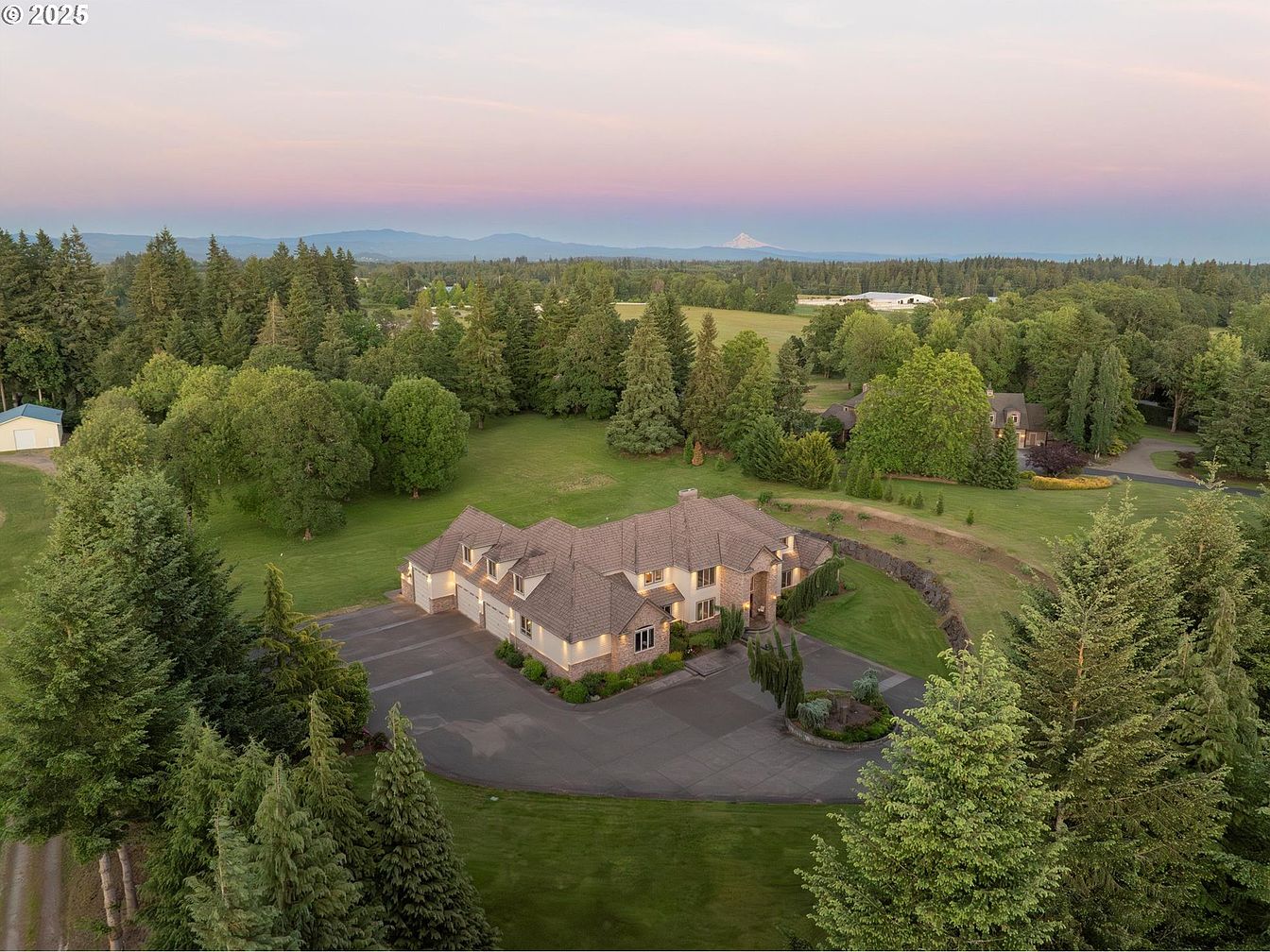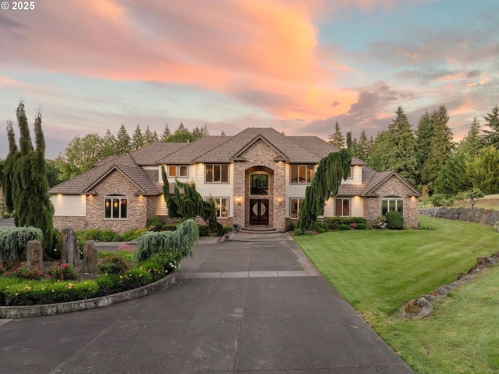 This impressive estate is nestled within a vast, lush landscape surrounded by mature trees and expansive green lawns. The home features a large, multi-gabled roof with a neutral, earthy tone that complements its natural setting. The exterior walls combine stone accents with light-colored siding, creating a balanced and elegant look. A spacious driveway leads up to a multi-car garage, accented by well-manicured shrubbery and trees lining the front entrance. Beyond the home, sprawling fields and dense woods extend to the horizon, with distant mountain views under a soft, pastel sunset sky, emphasizing tranquility and privacy.