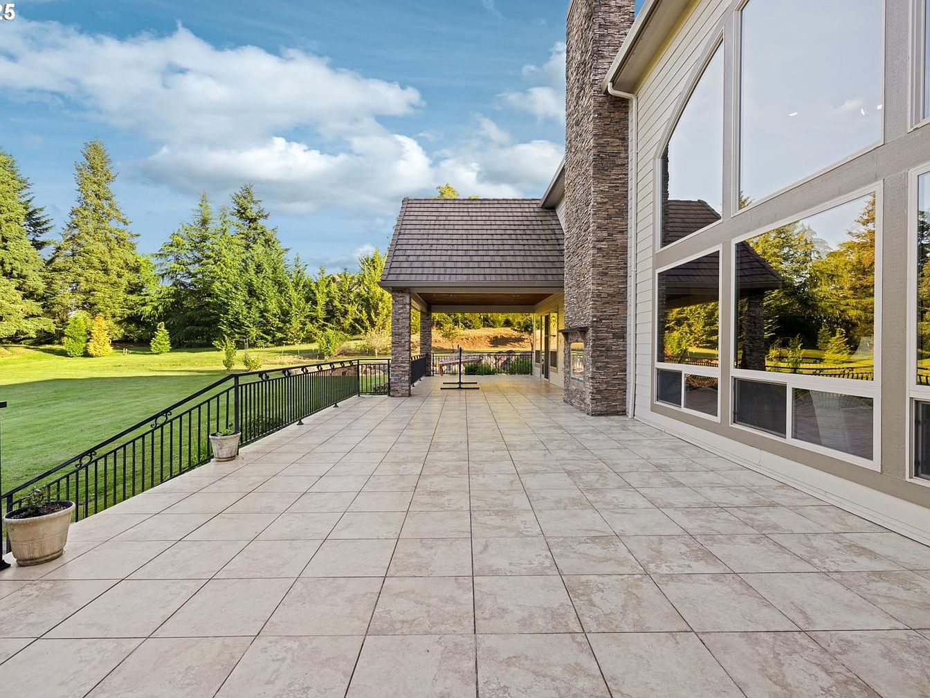 This expansive outdoor patio boasts large, light-colored stone tiles that create a clean, elegant base. A sturdy black metal railing lines the edge of the spacious terrace, providing safety without obstructing views. The area is framed by tall, lush trees and a vast green lawn, emphasizing a close connection with nature. Part of the patio is covered with a stylish overhang supported by stone-clad columns, offering a shaded retreat. The home’s exterior features a tall stone fireplace and large windows with beige trim that bring warmth and natural light, blending indoor and outdoor living beautifully.