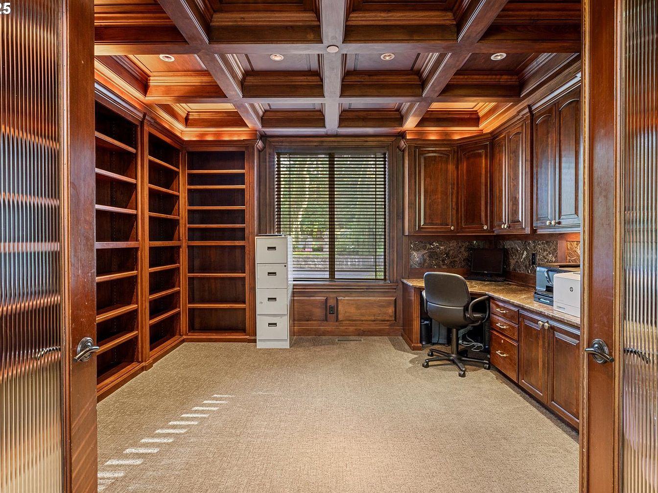 This elegant home office doubles as a library with rich wood paneling and built-in shelving that extends from floor to ceiling along one wall. The deep wooden tones continue with a coffered ceiling, adding warmth and architectural sophistication. A large window with dark blinds allows natural light to filter in, highlighting the plush beige carpeting underfoot. The opposite wall features custom cabinetry with granite countertops, integrated with workspace essentials such as a computer, printer, and filing cabinets. Glass-paneled French doors frame the entrance, creating an inviting yet private atmosphere for focused work or reading.