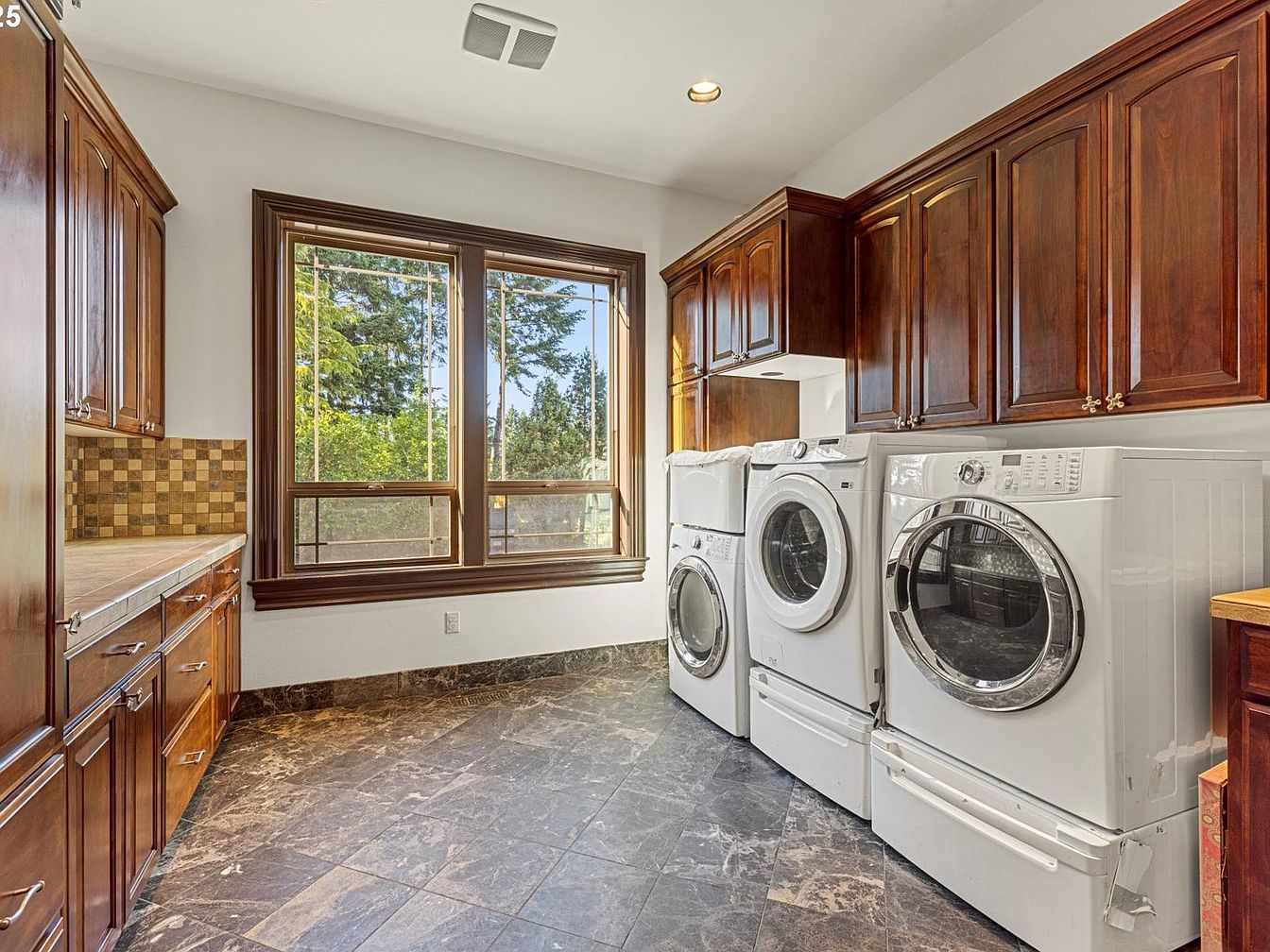 This spacious laundry room combines functionality with classic design. The floor is covered in dark marble-look tiles, which enhance the room’s elegance while being practical for frequent use. Rich, dark wood cabinetry lines the walls, offering ample storage, with both upper and lower cabinets providing organization for laundry essentials. A mosaic tile backsplash above the countertop adds a subtle pattern and warmth. Large wood-trimmed windows flood the space with natural light and frame a view of lush greenery outside. The room includes three modern white front-loading appliances arranged side-by-side, emphasizing efficiency and convenience.