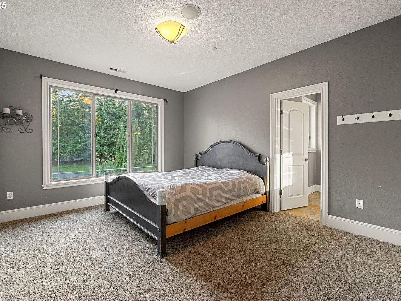 This bedroom features a spacious layout with soft, neutral-toned carpeting that enhances its cozy feel. Walls are painted in a sleek medium gray, contrasting nicely against the white trim around the large, triple-pane window that fills the room with natural light. The dark wood bed frame with subtle ornamental details sits prominently in the room, adorned with a patterned gray and beige bedspread. A simple ceiling light fixture provides overhead illumination. The room includes a doorway leading to an adjoining bathroom, and practical wall hooks add a touch of functionality to this understated, tranquil retreat.
