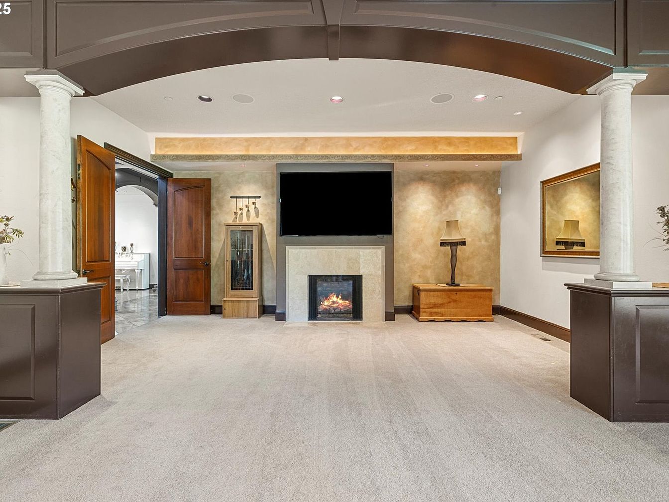 This spacious living room features a central fireplace framed with light stone tiles, topped by a large flat-screen TV mounted against an accent wall with a warm, textured faux finish. The room is framed by elegant white marble columns set atop dark brown wood bases that complement the trim and door frames. A ceiling with recessed lighting highlights the sophisticated arch above the fireplace area. Plush beige carpeting covers the floor, enhancing the cozy ambiance. The space is further accented with simple wooden cabinetry on each side, one side hosting a display cabinet and the other a lamp on a wooden chest, balancing form and function.