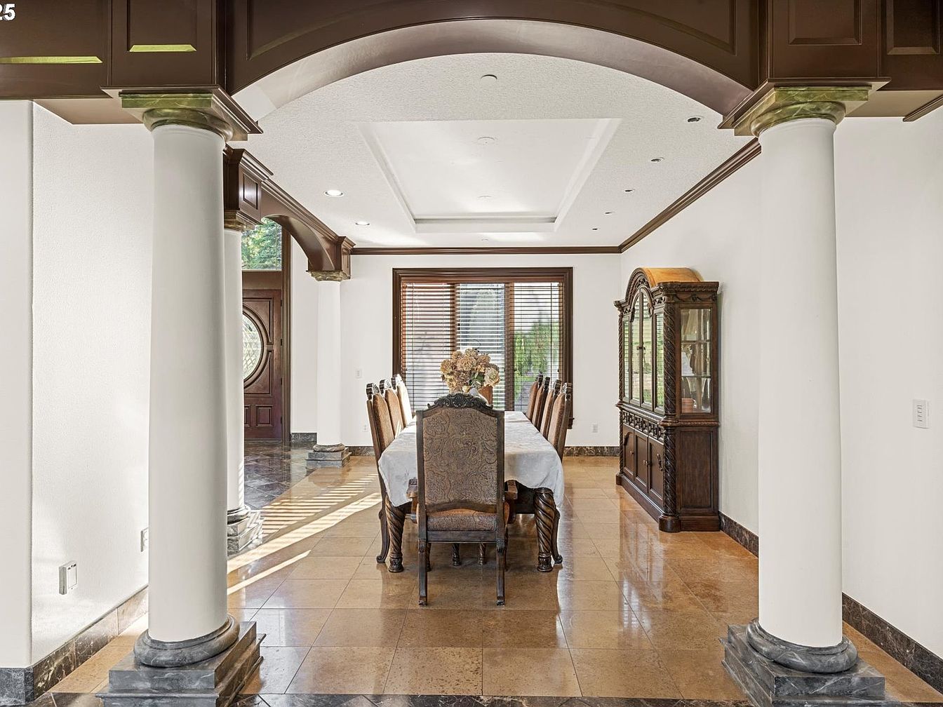 This elegant formal dining room features a classic design with two prominent white columns framed by dark marble bases and capitals, creating a grand entrance. The room’s centerpiece is a long wooden dining table covered with a white tablecloth, surrounded by ornately carved, upholstered chairs that add a traditional touch. The floor combines light brown tiles with a darker border, complementing the dark wood trim along the ceiling and the large window with wood blinds that fill the space with natural light. An antique-style wooden china cabinet lines one wall, enhancing the room’s refined aesthetic.