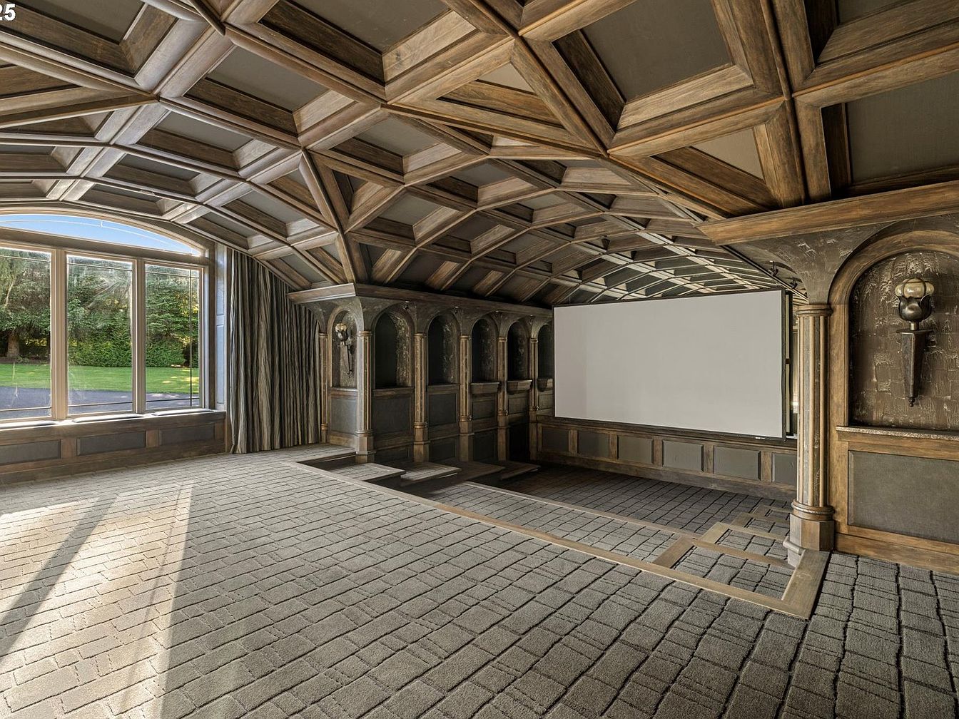 This home theater features a tiered seating layout with elevated platforms covered in a muted gray carpet that complements the textured, dark wood tones throughout. The ceiling is a focal point, intricately designed with a coffered pattern framed in rich wood beams, imparting a classical, sophisticated atmosphere. Walls are adorned with arched recesses and sconces that enhance the room’s luxurious feel. A large window with an arched top allows natural light and views of lush greenery outside, adding contrast and balance to the enclosed, cozy media environment dominated by a sizable projection screen at one end.