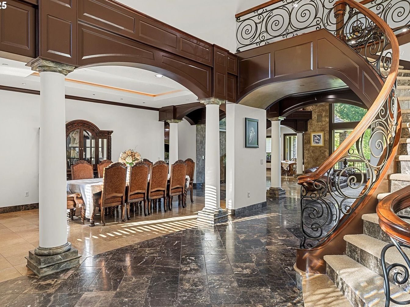This elegant home entryway features a sweeping curved staircase with ornate wrought iron balusters and rich wooden handrails, leading upwards from a polished dark marble floor. Adjacent, large white columns with decorative bases support dark wood paneling that extends across the ceiling arches and trim. The adjoining formal dining space showcases a classic style wooden dining table with high-back upholstered chairs in warm brown tones. Neutral walls and subtle ceiling recessed lighting create a refined, airy atmosphere. Expansive windows bring natural light, enhancing the luxurious yet inviting traditional aesthetic.
