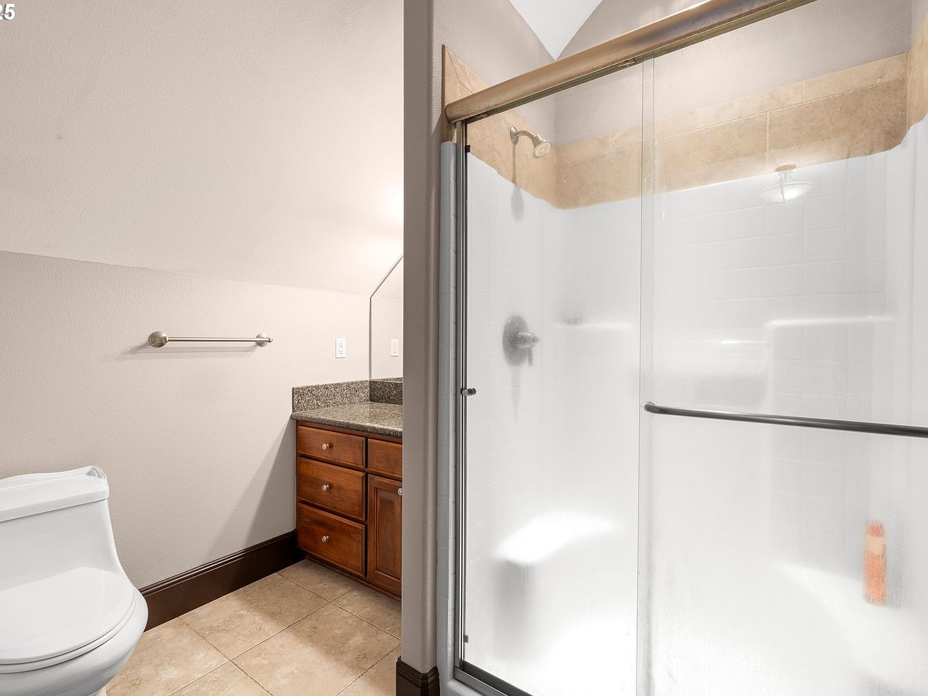 This bathroom combines practical design with a warm, neutral color palette. The glass-enclosed shower features white tile walls with a beige-tiled accent band near the ceiling, giving a subtle contrast and elevated texture. The sliding glass door includes a sturdy metal frame and handle, ensuring ease of access and durability. Adjacent to the shower, the vanity boasts a dark granite countertop atop rich wood cabinetry with multiple drawers and knobs, enhancing storage and workspace. Beige floor tiles, light walls, and dark wood baseboards create a harmonious and clean atmosphere, ideal for a relaxing daily routine.