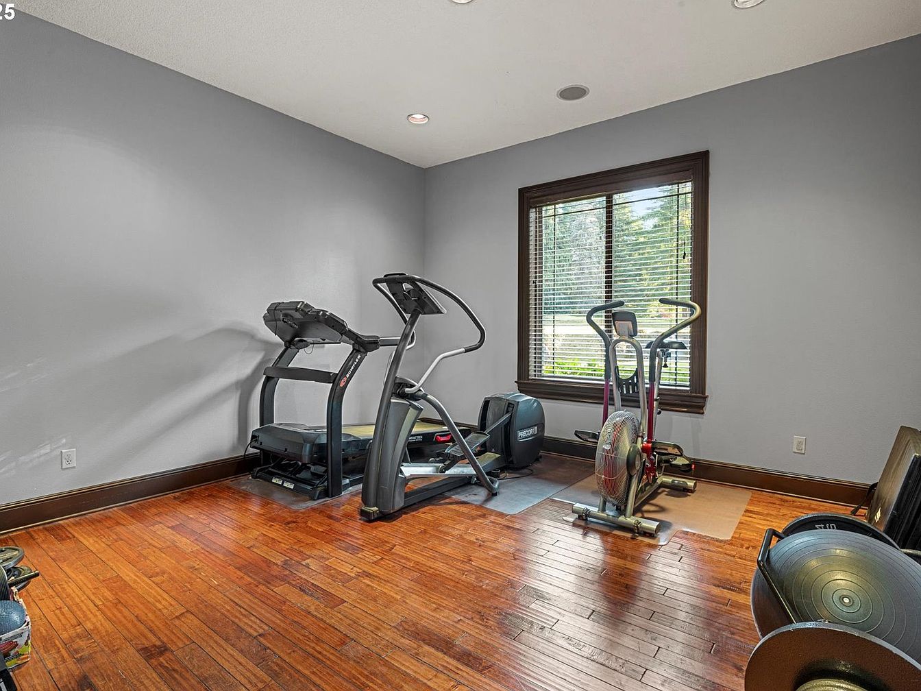 This dedicated workout room features a clean and minimalist layout with ample space for exercise. The walls are painted a soft gray, offering a calm ambiance that complements the warm, natural tones of the polished hardwood flooring. A large window framed in rich dark wood allows natural light to fill the space, enhancing the room’s airy feel. Equipment includes a treadmill, elliptical trainer, and fan bike, all positioned on protective floor mats. Additional fitness gear like weights and a stability ball are conveniently stored to the side, emphasizing practicality within this inviting home gym.