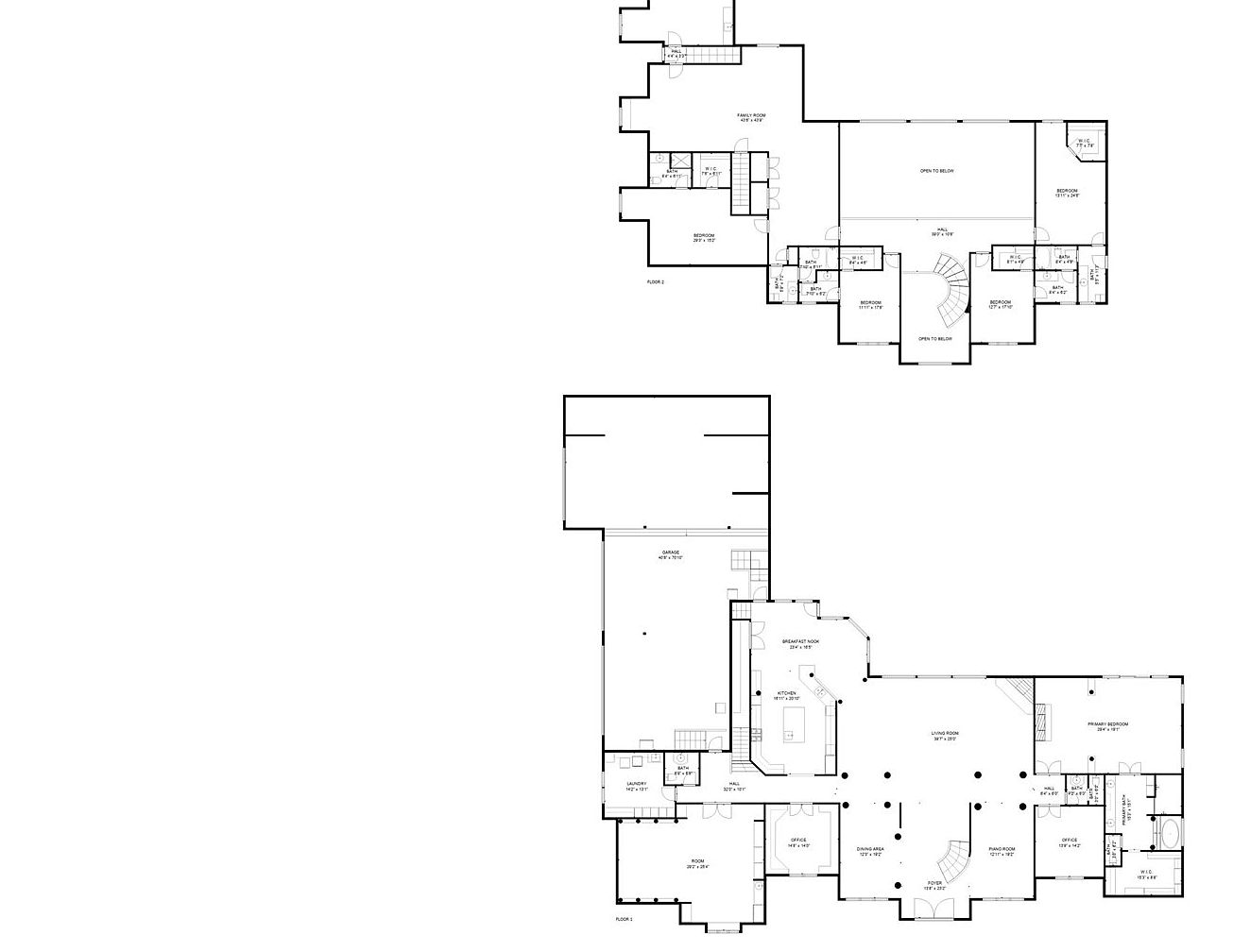 This floor plan presents a spacious two-level home with an expansive open layout. The first floor includes a large living room centered around a curved staircase, branching into a dining area, piano room, and a kitchen with a breakfast nook. Adjacent are an office, laundry, a large three-car garage, and a primary bedroom suite with a lavish bathroom and walk-in closet. Upstairs offers multiple bedrooms, each featuring walk-in closets and en-suite baths, alongside a family room and open vaulted ceilings looking down to the first floor below. The design emphasizes comfort, openness, and functional luxury.
