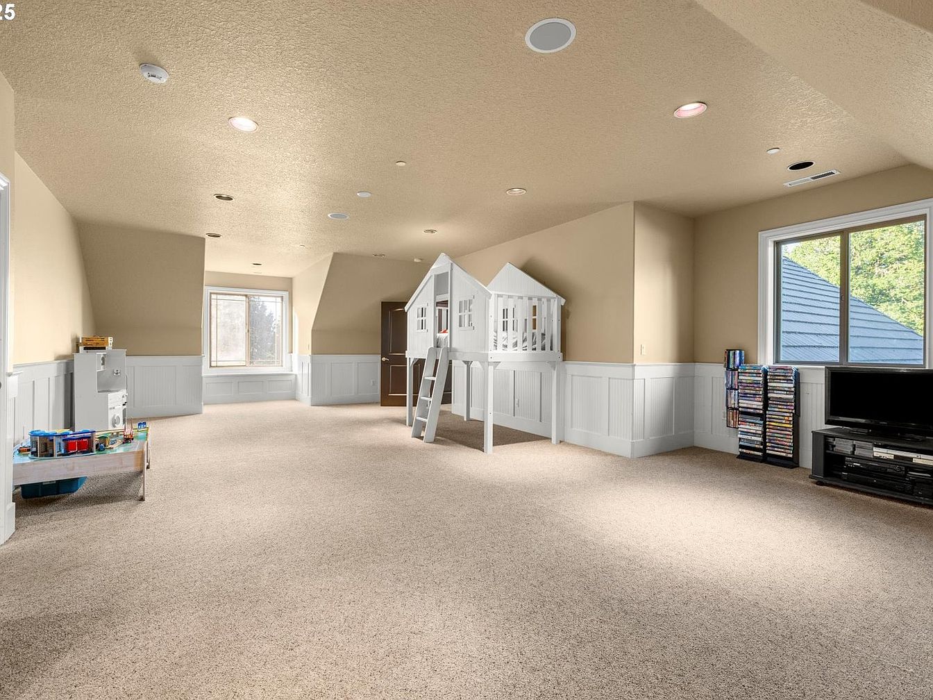This spacious playroom features a warm, neutral palette dominated by beige walls and light tan carpeting, creating a cozy and inviting environment. White wainscoting adds a classic touch, wrapping the lower half of the walls for added texture and style. A charming white wooden playhouse bed with a ladder serves as a focal point, perfect for children’s imaginative play. The large windows provide abundant natural light, brightening the room while showcasing views of greenery outside. In one corner, a media setup includes a TV on a black stand and neatly organized DVDs, balancing play with entertainment. Recessed lighting enhances the clean, open layout, ideal for both playtime and relaxation.