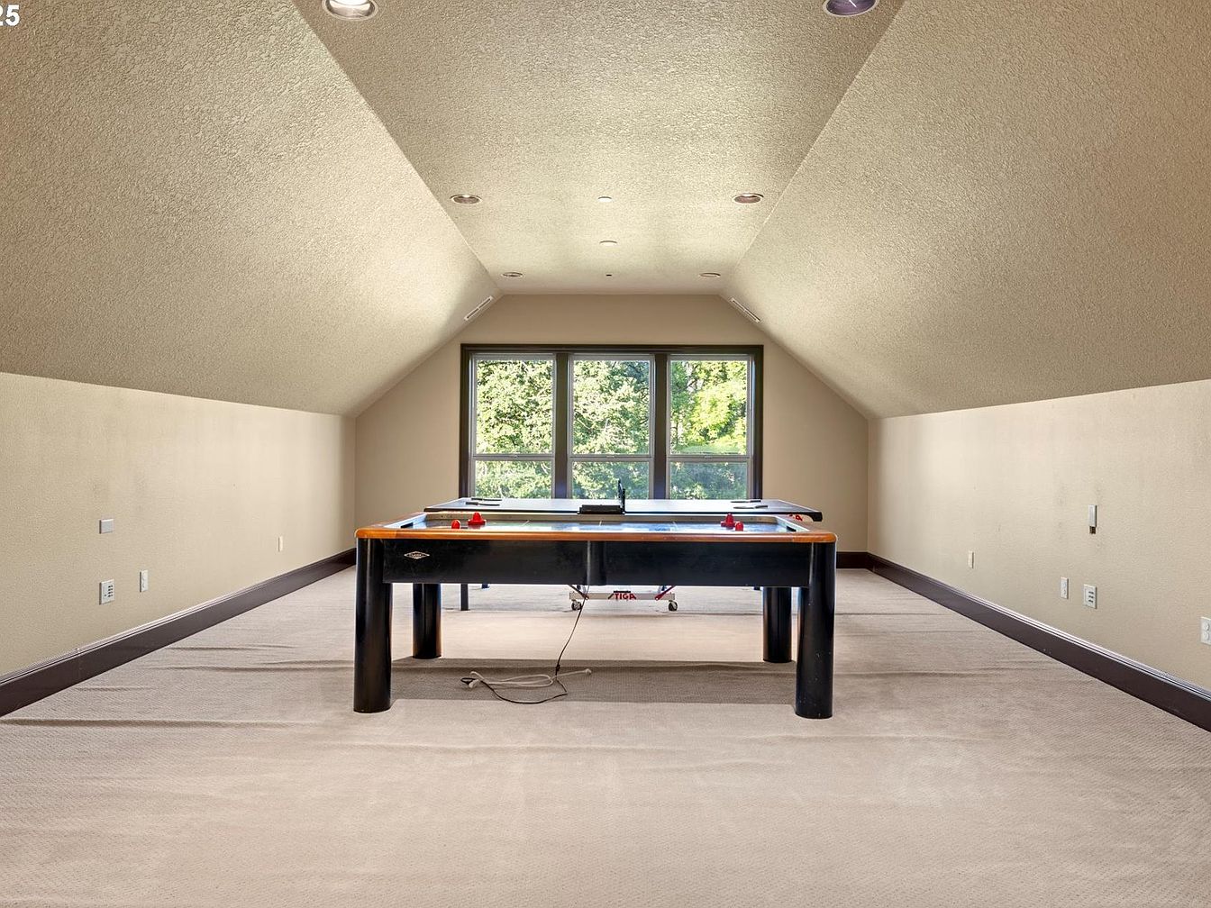This room features a cozy, attic-style layout with sloped ceilings painted in a neutral beige tone. The walls maintain a matching beige, creating a warm, inviting atmosphere, complemented by dark brown baseboards that add contrast and definition. Centered beneath a large trio of windows that provide natural light and a view of lush greenery outside, a black air hockey table with wooden edging serves as the focal point, positioned on a soft, beige carpet that cushions the floor. Six recessed ceiling lights ensure ample illumination for evening play and leisure activities.