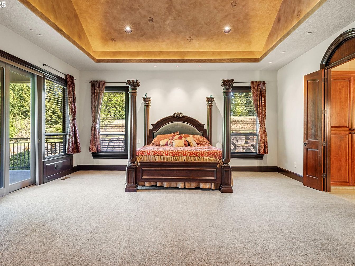 This spacious master bedroom features a regal four-poster bed with intricate carved details, set against a bright white wall. Large windows framed with dark trim and patterned drapes allow natural light to fill the room while offering views of lush greenery. The beige carpet complements the warm wood tones of the door and baseboards. A standout element is the coffered ceiling with a gold-leaf finish and embedded lighting, adding warmth and elegance. Sliding glass doors lead to an outdoor balcony, enhancing the sense of openness and connection to nature.