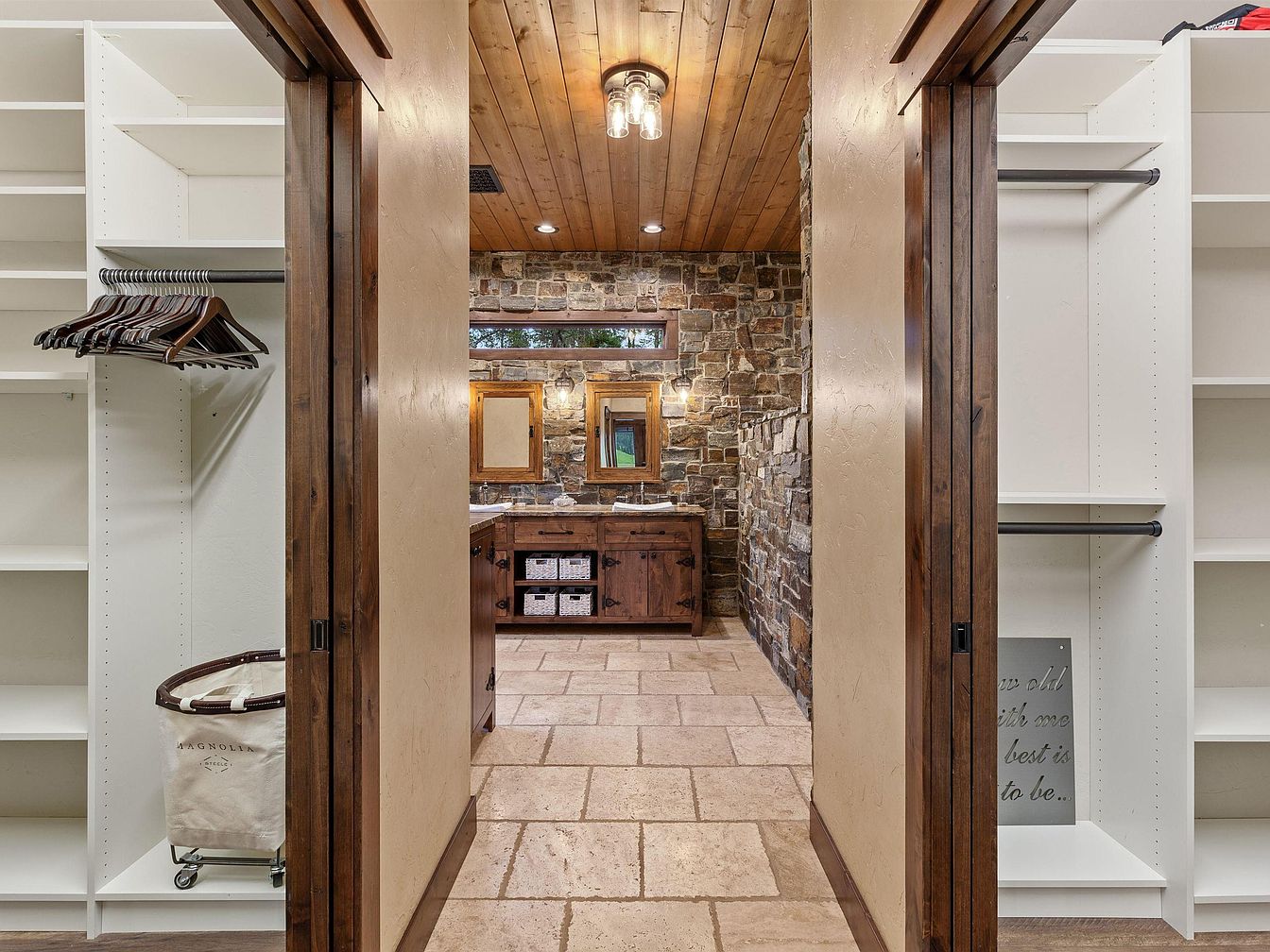 This passageway leads from a walk-in closet area into a master bathroom. The closet features bright white shelving and hanging rods on either side, contrasted by warm wooden sliding doors. The bathroom itself flaunts a rustic, earthy aesthetic with its rough-hewn stone walls and beige tiled flooring arranged in a staggered pattern. A wooden ceiling complements the wooden vanity, which includes a double sink and open shelving holding woven baskets. Natural and recessed lighting enhances the cozy atmosphere, highlighting the blend of contemporary storage and natural materials throughout the space.