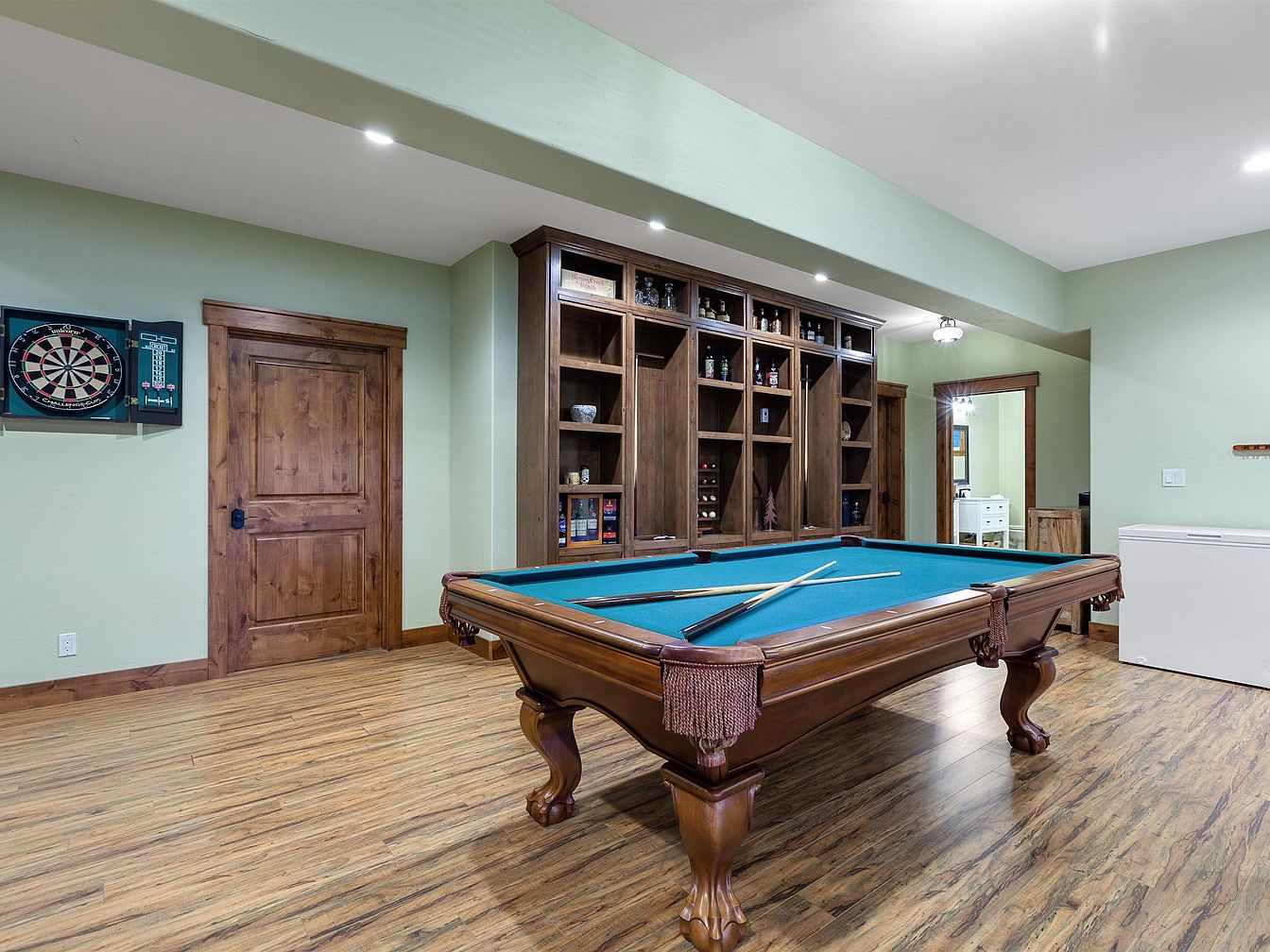 This inviting game room centers around a classic wooden pool table with intricate carved legs and a rich teal playing surface, complemented by matching cues resting atop. The flooring is a textured wood-style laminate, bringing warmth and natural texture underfoot. Pale green walls provide a soft backdrop that enhances the darker wood tones throughout the room, including the trim, doors, and a built-in shelving unit designed for display and storage of bottles, décor, and games. A dartboard mounted on one wall adds to the recreational vibe, while recessed ceiling lights offer bright, even illumination.