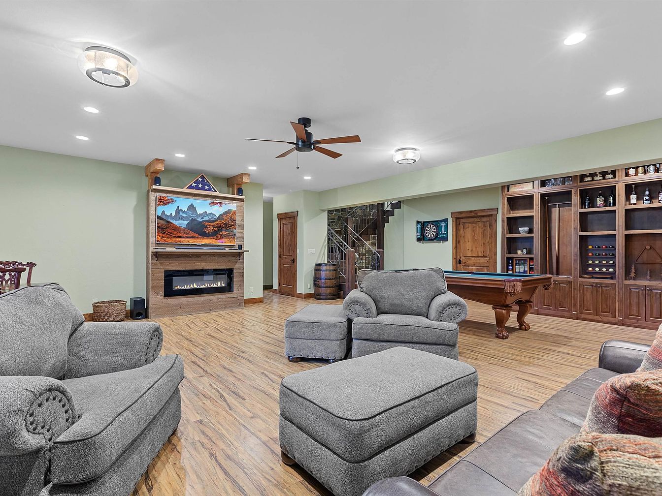 This spacious recreation room features warm wood flooring that complements the soft green walls and wooden trim throughout. Plush gray armchairs and matching ottomans are arranged near a modern linear fireplace with a natural wood mantel, topped by a large scenic landscape image. The room includes a pool table with ornate legs placed beside custom-built wooden cabinetry that offers storage and display space for bottles and games. A dartboard mounted on the wall adds to the entertainment vibe. Warm ceiling lights and a ceiling fan enhance comfort, while a staircase with wrought iron details leads to other parts of the home.