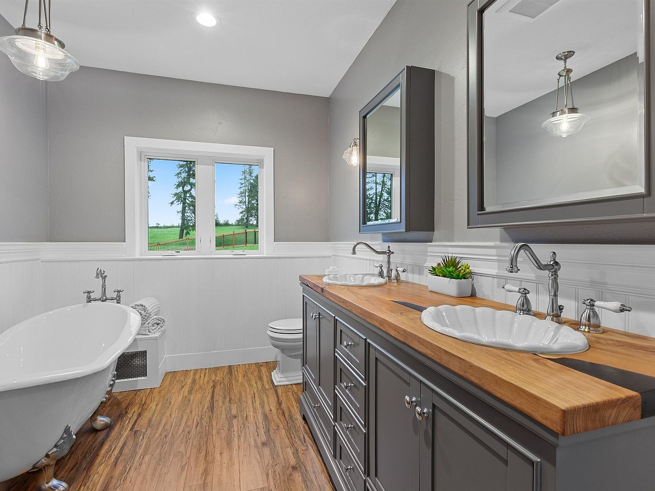 This bathroom features a blend of modern and vintage charm with a spacious layout. The focal point is a long double vanity painted in elegant gray, topped with a warm wood countertop that adds natural texture. Two white, scallop-edged sinks complement the silver faucets, echoing the clawfoot tub’s polished fixtures. Above the vanity are two large, framed mirrors with matching gray cabinets, enhancing storage and style. The walls combine soft gray paint with white beadboard wainscoting, creating a bright, clean contrast. Flooring mimics natural wood grain, harmonizing with the vanity top. A window offers a serene view of greenery outside, flooding the space with natural light and augmenting the calm, inviting atmosphere.