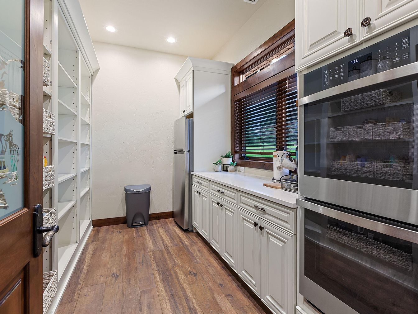 This butler’s pantry features a long, narrow layout with white cabinetry extending along one wall, topped by a pristine, solid white countertop. The opposite wall displays built-in shelving with neat, uniform baskets that provide organized storage. Warm wood flooring contrasts with the cabinetry, creating a cozy yet polished atmosphere. A stainless-steel double oven is integrated into the cabinetry on the right, indicating convenient access from the kitchen. A sizable window with dark wooden blinds lets in natural light, framed by wood trim that complements the door and floor tones. Recessed lighting illuminates the space evenly, enhancing functionality and aesthetic appeal.