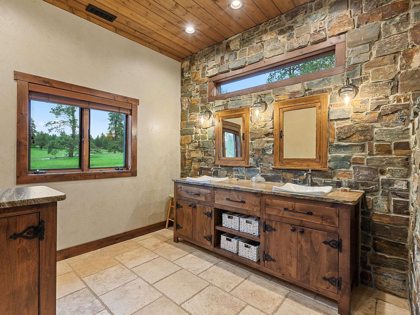 This bathroom features a charming rustic design with a strong emphasis on natural materials. The focal point is a large wooden vanity with two vessel sinks, topped by a polished stone countertop. The vanity combines warm wood tones with black metal hardware, lending a sturdy, handcrafted feel. Behind it, a distinctive stone accent wall adds texture and depth, illuminated by three vintage-style wall sconces. A narrow clerestory window above the mirrors allows natural light to filter in. The ceiling is finished in rich wood planks with recessed lighting, complementing the neutral tile floor and beige wall, creating a cozy, earthy ambiance.