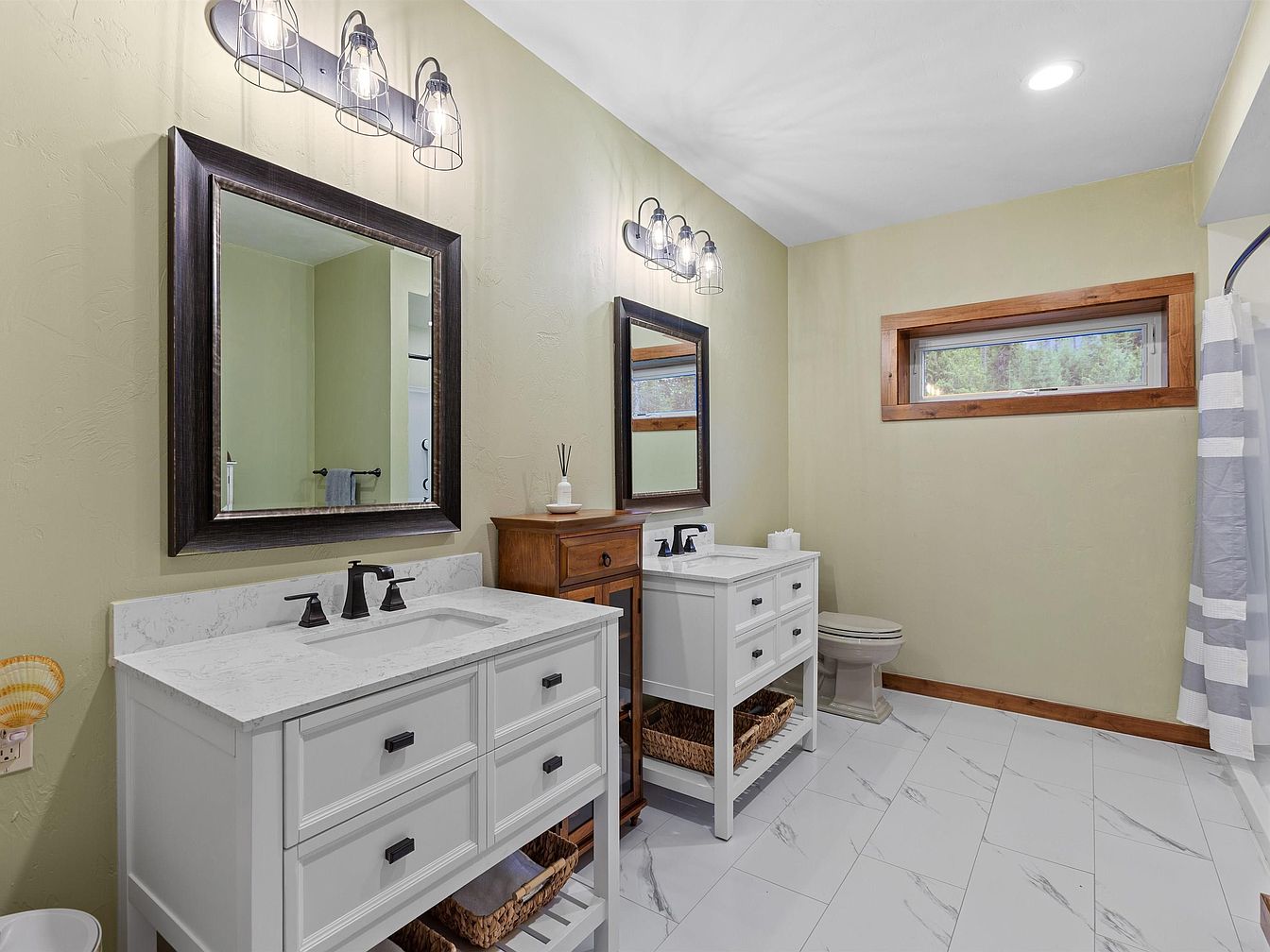 This bathroom features a spacious layout highlighted by two white vanity units, each topped with marble-style countertops and under-mount sinks. The vanities are separated by a small wooden cabinet offering additional storage and a warm natural wood tone that complements the window trim. Above each sink is a large, dark-framed mirror paired with industrial-style light fixtures encased in wire cages, providing ample illumination. The walls are painted a soothing light beige, and the floor is tiled with large white slabs accented by subtle gray veining, enhancing the clean, modern yet rustic design. A striped shower curtain adds a soft touch near the toilet area.