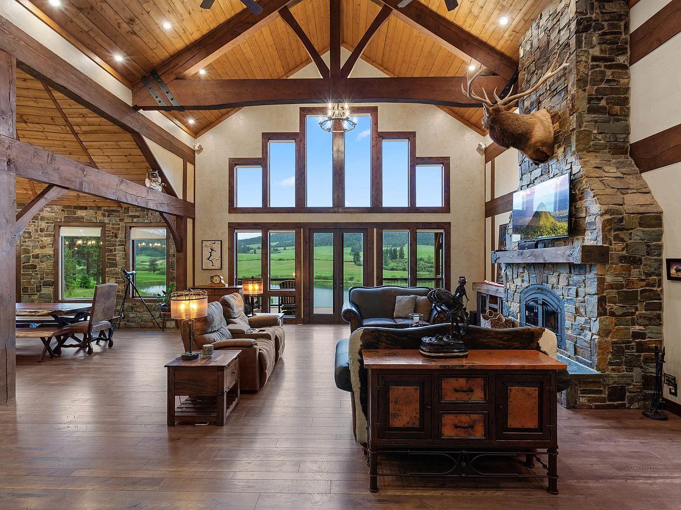 This expansive living room features a vaulted ceiling with exposed wooden beams and warm wood paneling that complement the wide plank hardwood floors. Floor-to-ceiling windows with dark wood frames flood the space with natural light while offering spectacular panoramic views of lush green fields and trees. The stone fireplace, highlighted by a mounted elk head, forms a striking focal point with a large flat-screen TV above the rustic wooden mantle. Comfortable leather and upholstered seating are arranged to create a cozy gathering spot, enhanced by strategically placed table lamps that cast a warm, inviting glow. An adjoining dining area with stone walls and large windows extends this open, airy design.