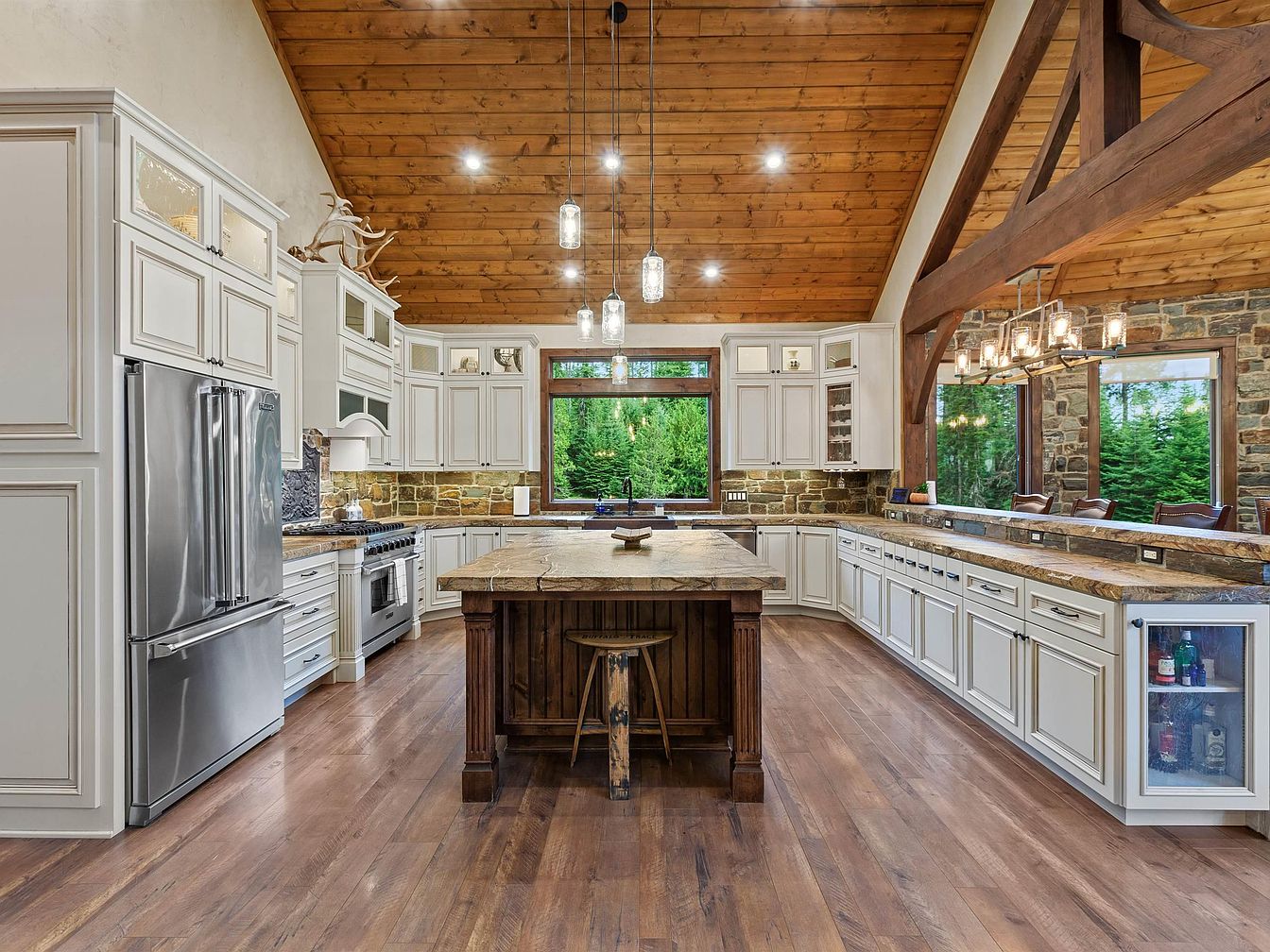 This spacious kitchen features a vaulted wood-paneled ceiling with exposed dark wood beams that add warmth and architectural interest. A central island with a rustic wooden base and natural stone countertop serves as a focal point, complemented by a single distressed stool tucked underneath. Surrounding the island, white cabinetry with classic moldings contrasts beautifully with a textured stone backsplash, continuing around the room for a cozy yet elegant feel. Large windows and glass details invite natural light while providing a lush, green view. Stainless steel appliances and pendant lighting with glass shades lend a modern touch to the overall rustic ambiance.