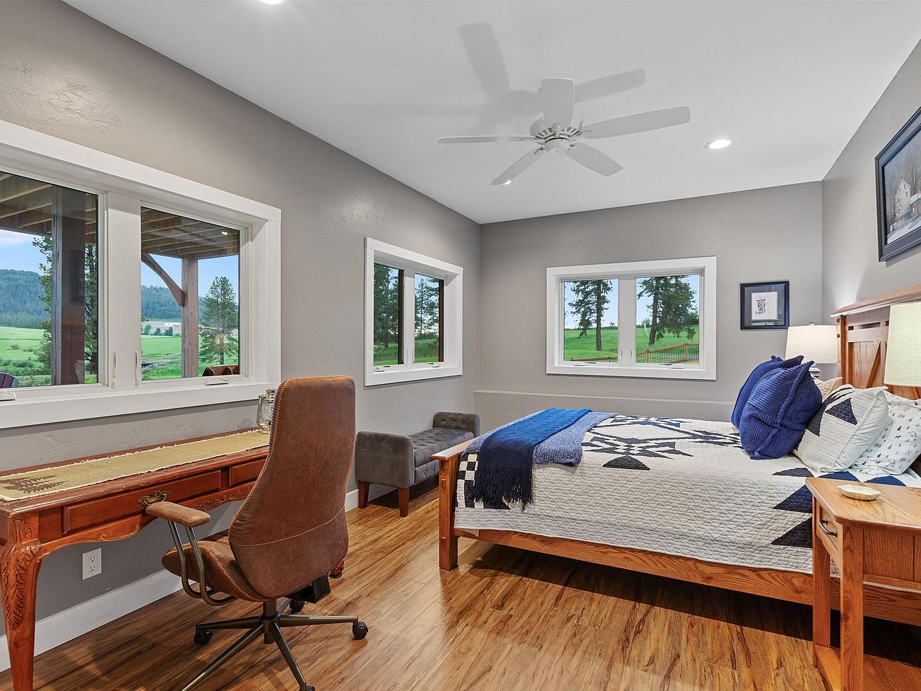 This cozy bedroom features a harmonious blend of functionality and comfort. The room is painted in soft gray tones that complement the warm wood flooring and furniture, creating a rustic yet modern ambiance. A wooden bed adorned with a quilt showcasing a geometric pattern in navy and white is the focal point, matched with deep blue pillows and a throw for added texture. Multiple windows allow natural light to fill the room and offer scenic views of green landscapes outside. A classic wooden desk paired with a brown leather swivel chair creates a practical workspace, while a plush gray bench sits under one window, enhancing the room’s inviting atmosphere. A white ceiling fan and recessed lights add to the room’s simplicity and comfort.