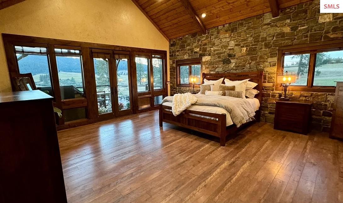 This spacious master bedroom combines rustic charm with modern comfort, featuring a vaulted ceiling clad in warm wood planks and exposed beams that enhance the cozy atmosphere. A striking stone accent wall anchors the room, behind a solid wood bed layered with plush, neutral-toned bedding and textured throw blankets. Two matching nightstands with ambient lamps add symmetry and warmth. The wood flooring complements the ceiling’s natural finish, extending across the room and reflecting soft light. A set of wide glass doors and windows bring in natural light and offer stunning views of the surrounding landscape, emphasizing connection to nature.