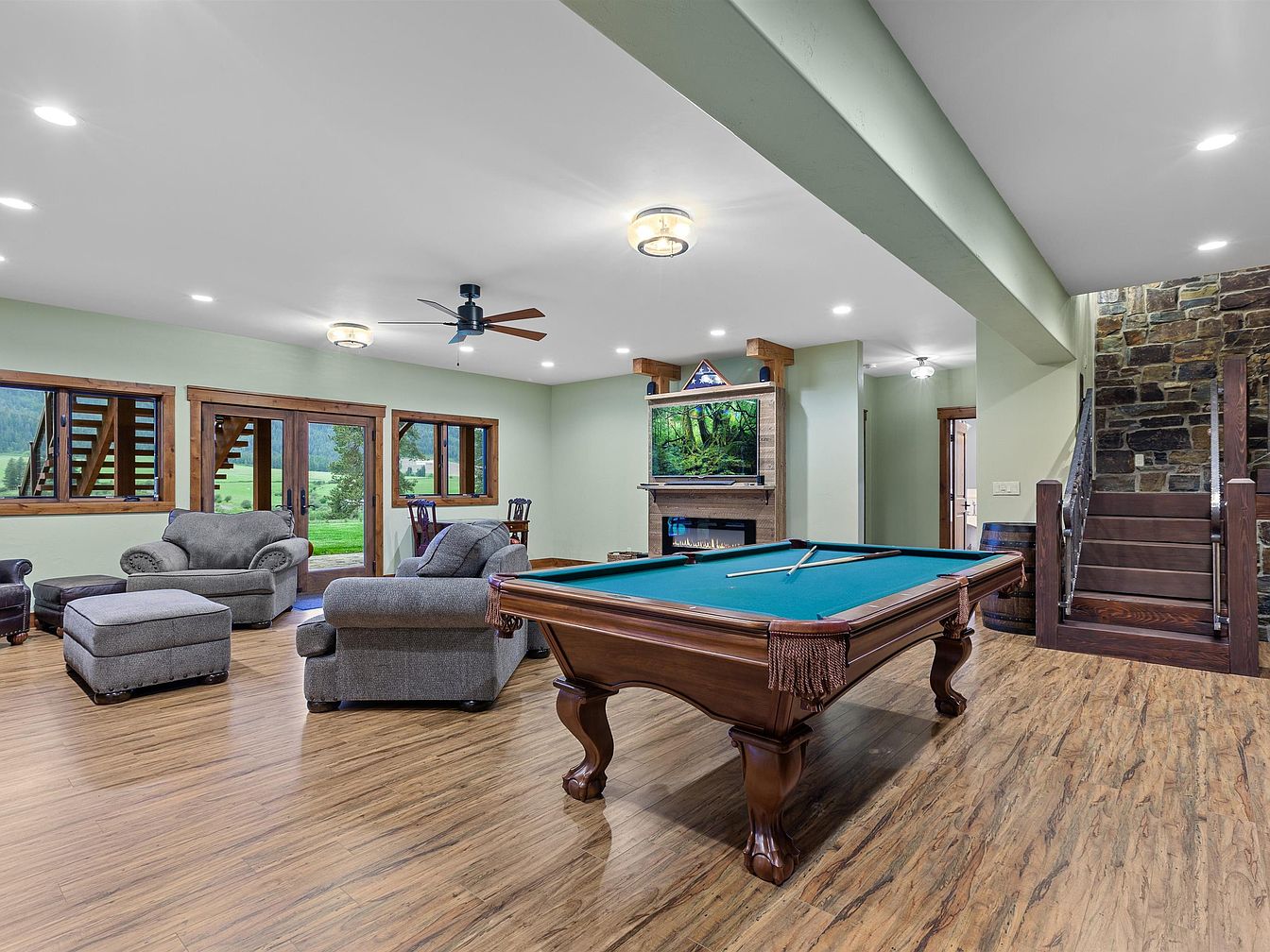 This spacious recreation room features warm wood flooring that complements the natural stone wall alongside the staircase. The walls are painted a soft sage green, creating a calm and inviting atmosphere. A large, classic wooden pool table with teal felt sits prominently in the center, inviting friendly games. Comfortable gray upholstered armchairs and a matching ottoman provide a cozy seating area near glass doors and windows, which offer ample daylight and scenic views of the greenery outside. A ceiling fan and modern recessed lighting fixtures enhance the room’s comfort and brightness, while a gas fireplace with a mounted TV adds a perfect entertainment focal point.