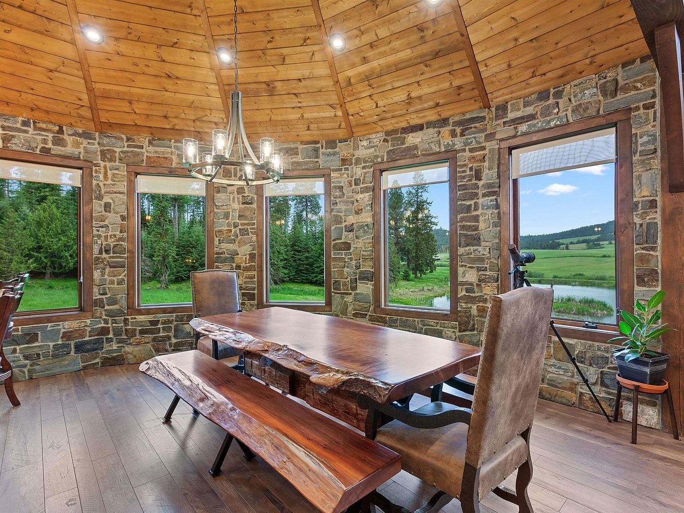 This cozy dining space features a rustic, natural aesthetic with stone walls that curve gently around a series of large windows, inviting abundant natural light and stunning views of lush greenery and a serene pond. The ceiling is crafted from warm-toned wood planks set in a vaulted style, accentuated by recessed lighting and a modern chandelier with clear glass shades. A substantial live-edge wooden table forms the centerpiece, paired with a matching bench and upholstered chairs, blending organic textures with comfort. The overall atmosphere is one of rustic elegance that harmonizes indoor comfort with outdoor beauty.