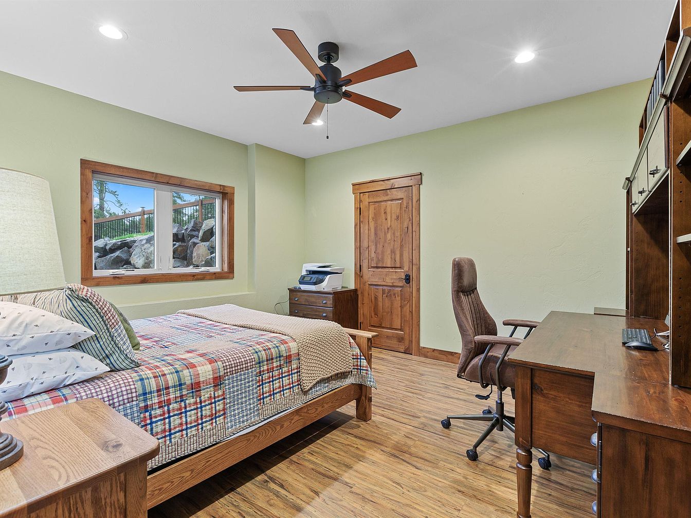 This cozy guest bedroom features a harmonious blend of functionality and rustic charm. Light green painted walls create a calm atmosphere, complemented by rich wood trim that frames the window and door, bringing warmth to the space. A wooden bed with a colorful patchwork quilt adds a homey touch, paired with a nightstand and table lamp for subtle lighting. Opposite the bed, a spacious wood desk with a high-backed office chair offers a practical workspace. The ceiling fan with wood blades and recessed lighting ensures comfort and brightness, while the wood-look flooring completes the inviting aesthetic.