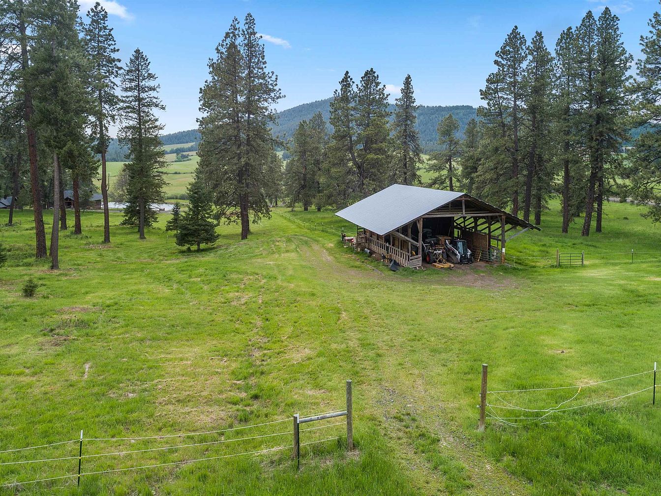 This open-sided structure is situated in a lush green meadow surrounded by tall pine trees and rolling hills. The shelter has a simple, peaked metal roof supported by wooden beams, giving it a rustic and functional appearance. It houses various farm and lawn equipment, indicating its purpose for storage and protection from the elements. The landscape around it is expansive with a natural, pastoral feel, marked by a dirt path leading to the structure and fenced boundaries. The overall scene evokes a peaceful rural aesthetic with practical design tailored to outdoor and agricultural needs.