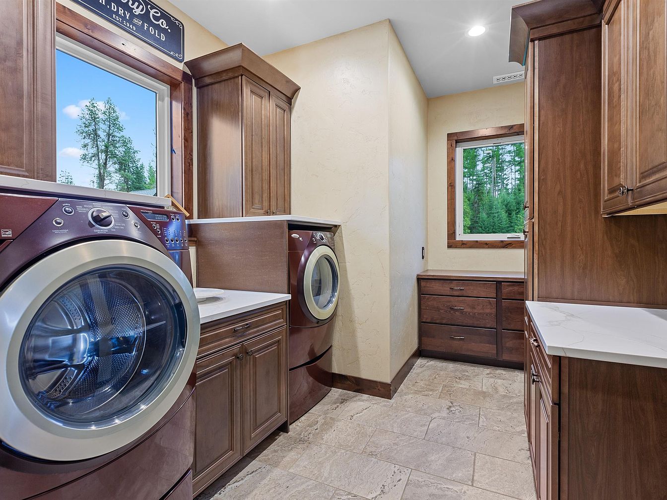 This laundry room features a spacious and organized layout with rich wood cabinetry that adds warmth and sophistication. The washer and dryer are front-loading models in a deep burgundy hue, creating a striking contrast against the neutral beige walls. The countertops are white with subtle veining, offering a clean workspace for folding or sorting laundry. Natural light floods the space through two windows framed with dark wood trim, highlighting the surrounding greenery outside. The floor is covered in large beige tiles with a natural stone texture, complementing the room’s rustic yet polished aesthetic.