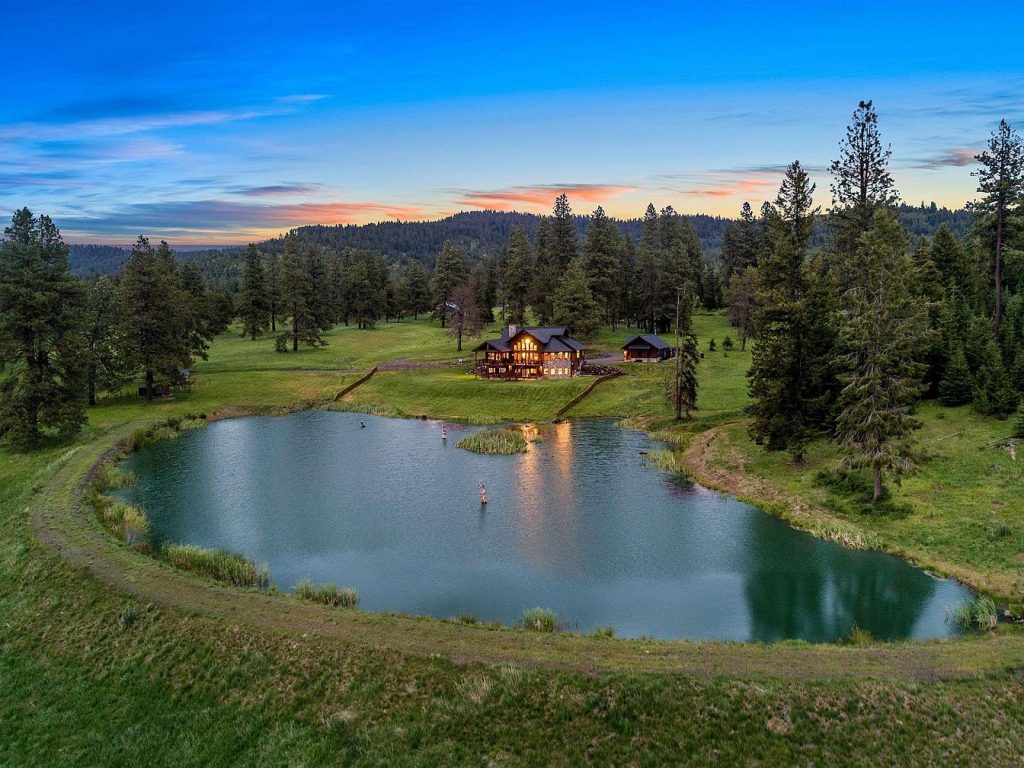 This serene estate is nestled in a lush, green landscape surrounded by tall pine trees and rolling hills. The focal point is a charming two-story home with warm, inviting lights glowing from numerous windows, reflecting off a peaceful private lake that sits in the foreground. Alongside the main residence, there is a smaller structure, possibly a guest house or cabin, harmonizing with the rustic setting. The expansive grassy yard gently slopes down to the water’s edge, emphasizing the tranquil and secluded atmosphere of this nature-immersed retreat at dusk.