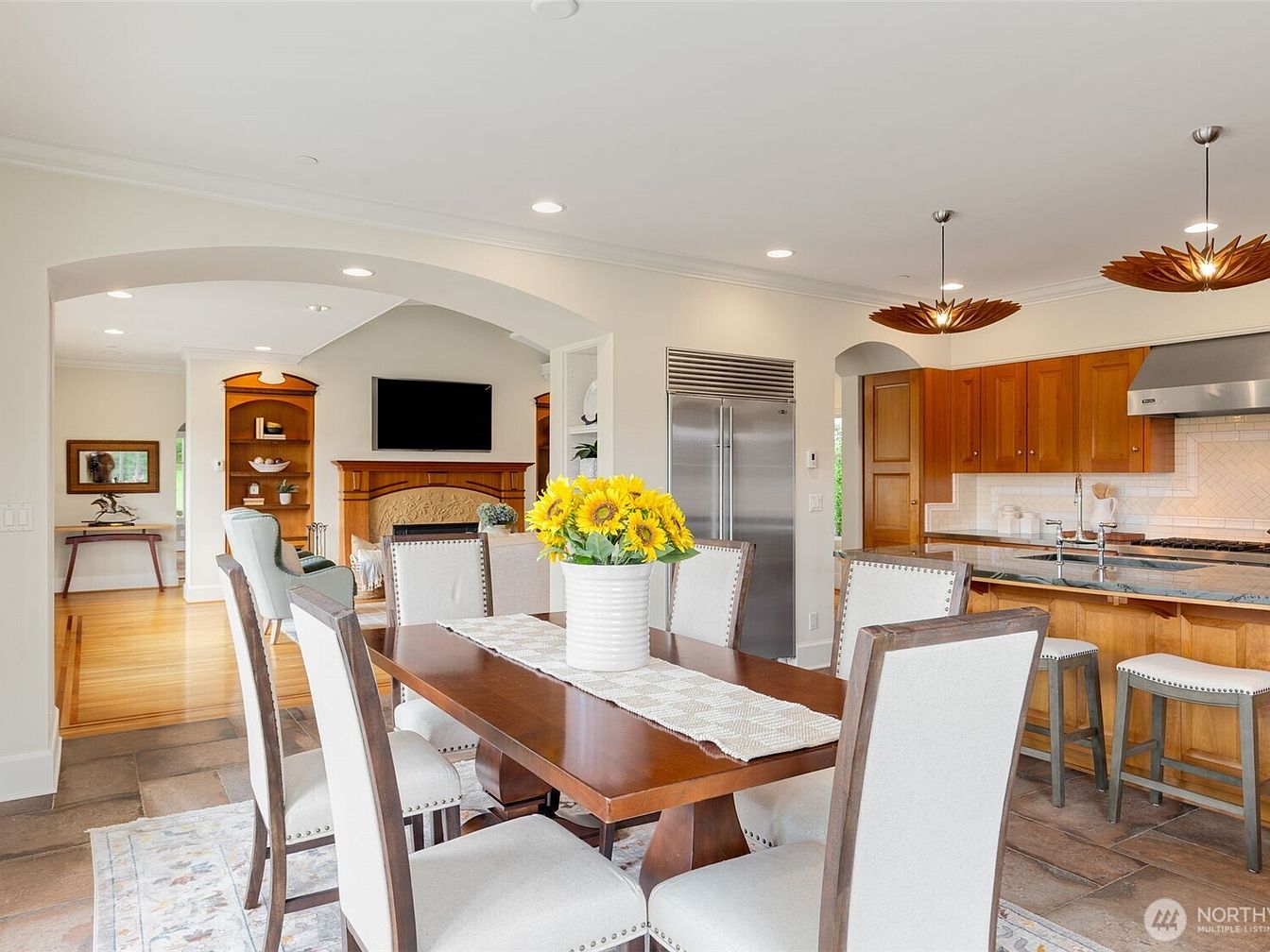The dining space features a polished wooden table surrounded by eight cushioned chairs with light beige upholstery accented by nailhead trim. Positioned centrally, the table holds a bright vase filled with sunflowers, adding a lively pop of color. The adjoining kitchen showcases warm wooden cabinetry with modern stainless-steel appliances, including a large double-door refrigerator and a sleek range hood. Natural stone tile flooring extends throughout, complementing the neutral walls and ceiling with recessed lighting. Two artistic pendant lights with petal-like wooden designs hang above the kitchen island, where cushioned bar stools offer casual seating. Arched doorways lead to an inviting living area with a fireplace and built-in shelving, illustrating an open, cohesive layout.