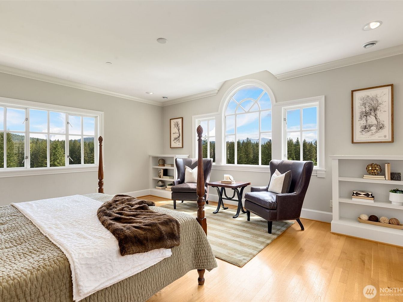 This spacious bedroom features a neutral color palette dominated by soft beige walls and light hardwood floors, creating a warm and inviting atmosphere. The room’s large windows, including an elegant arched centerpiece, flood the space with natural light and showcase scenic forest views. A classic four-poster bed with textured bedding anchors the room, complemented by a cozy, fur throw. Two dark leather wingback chairs flank a wooden side table on a striped area rug, establishing a stylish and comfortable seating nook. Built-in white shelving on either side adds subtle architectural detail and practical storage.