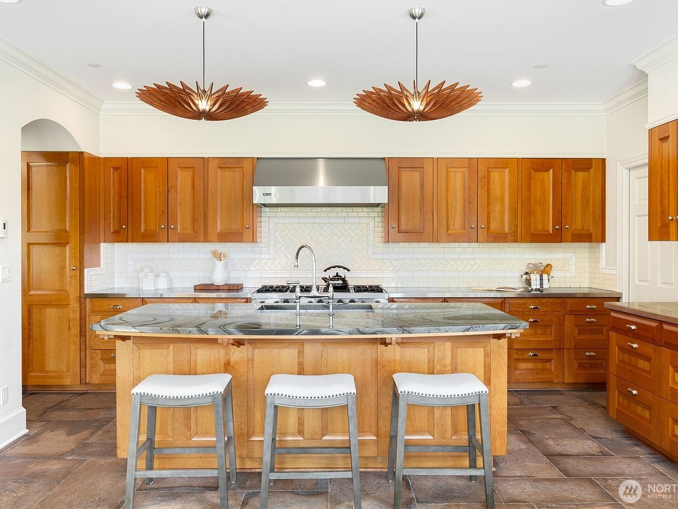 This kitchen features a spacious central island with a polished stone countertop incorporating varied natural patterns, paired with a wooden base matching the cabinetry. Three light-gray bar stools with stud detailing provide seating. Surrounding the island, warm honey-toned wooden cabinets with classic raised panel doors create a cohesive and inviting look. The backsplash is composed of white tile laid in a geometric herringbone pattern, framed by a simple tile border, complementing the shiny stainless-steel range hood centered above the stove. Unique wooden pendant lights with a petal-like design add an artistic flair, while the floor showcases a rustic, earthy-toned tile. The overall aesthetic blends traditional warmth with subtle contemporary touches.