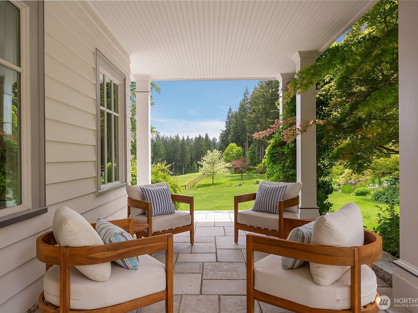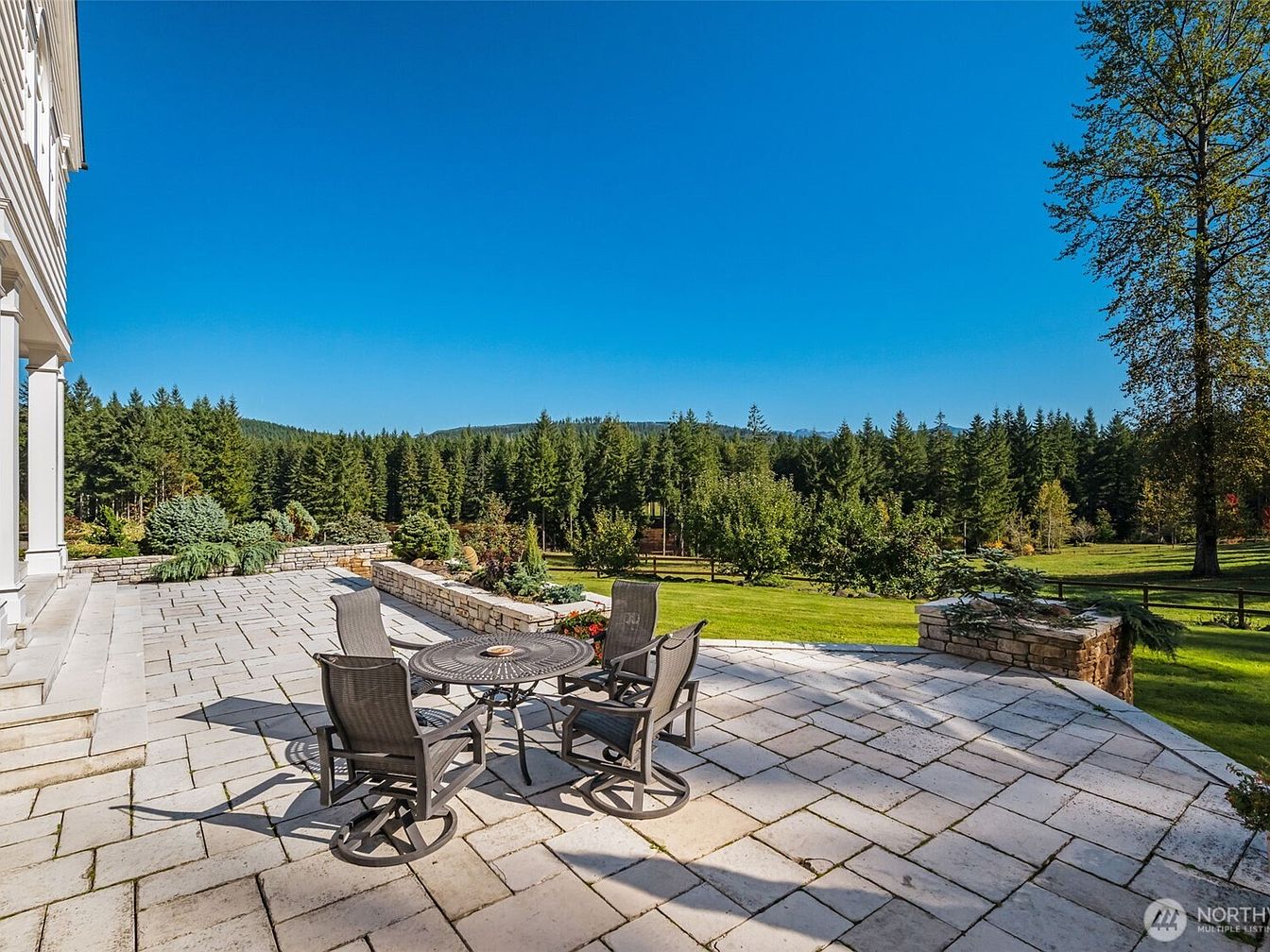 This expansive patio features a light stone tile floor arranged in a subtle, varied pattern, lending a classic yet refined touch. A round, metal table with four swivel chairs creates an inviting seating area perfect for outdoor dining or casual conversation. The patio extends from the home’s white-sided exterior with columns, seamlessly integrating indoor and outdoor spaces. A low stone retaining wall with planted greenery elegantly outlines the patio, adding texture and a natural element. The surrounding lush lawn and dense forest backdrop provide a serene, private ambiance under the bright blue sky.