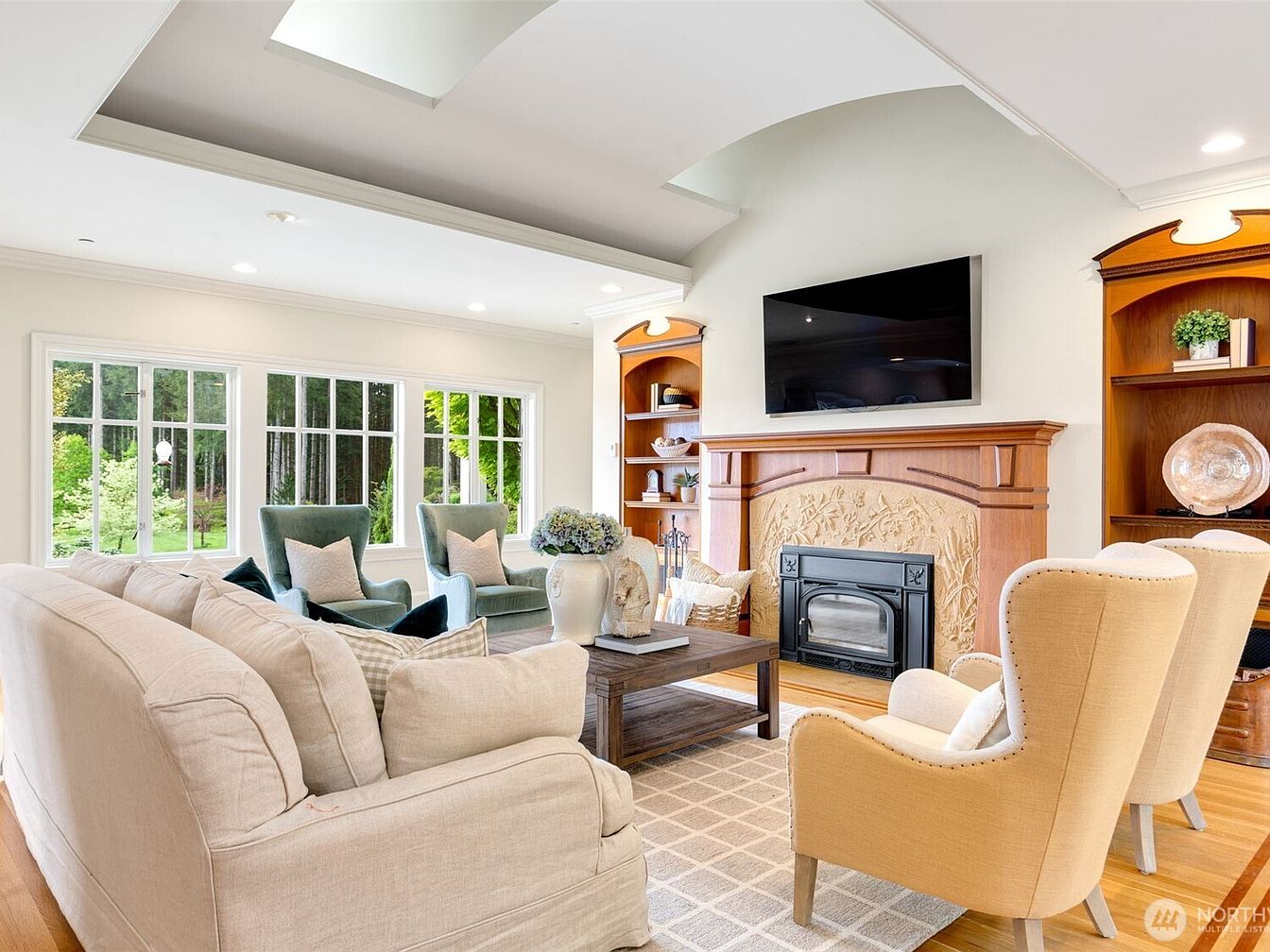 This spacious living area features a balanced blend of classic and modern elements. A vaulted ceiling with recessed lighting enhances the airy atmosphere, while large windows fill the room with natural light and offer serene views of the lush greenery outside. The focal point is a beautifully crafted wooden fireplace mantel with intricate detailing, flanked by built-in shelves showcasing tasteful decor. Seating includes a neutral-toned, plush sofa contrasted by two soft blue armchairs and two beige wingback chairs, all arranged around a dark wood coffee table atop a subtle patterned area rug. The soft color palette of creams, blues, and natural wood tones creates a cozy yet elegant ambiance.