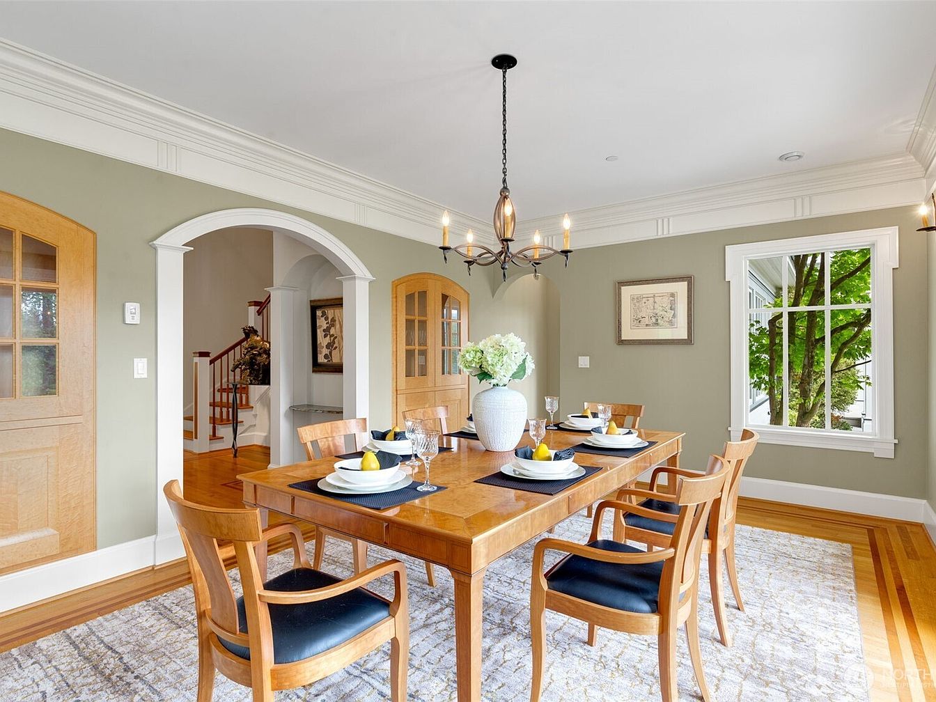 This elegant dining room features a warm, inviting color palette with soft sage green walls contrasted by crisp white crown molding and trim. A rectangular wooden table with a polished finish is surrounded by six matching chairs with dark cushioned seats, conveying comfort and style. The table is beautifully set with white dishware, dark placemats, and accents of yellow fruit for a pop of color. Above, a wrought iron chandelier with six candle-like lights adds a touch of classic charm. The room includes large windows allowing natural light and showcasing lush greenery outside. Architectural details like an arched doorway and built-in cabinetry enhance the refined ambiance.
